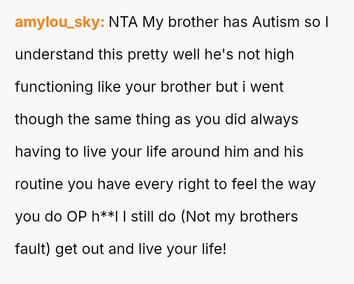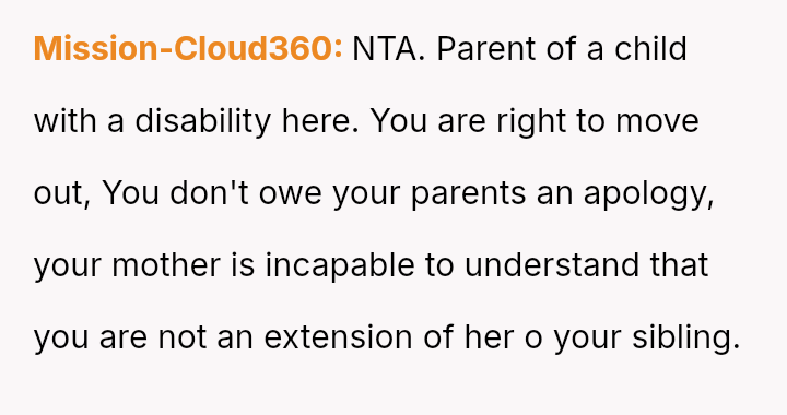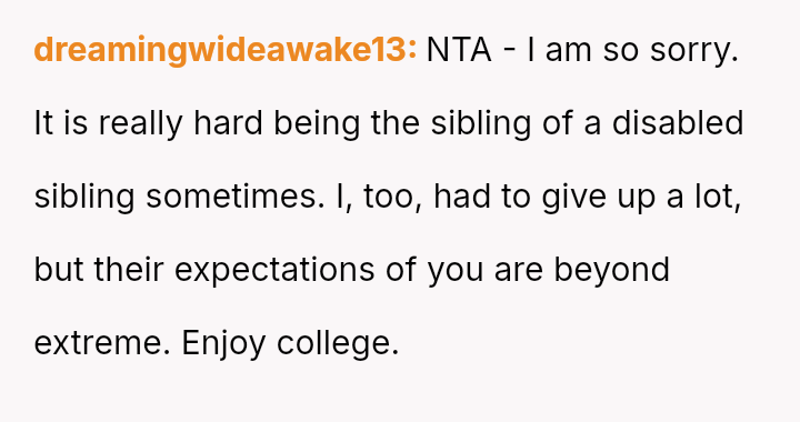 The core question remains: When a caretaker sibling sacrifices their entire life for another, does the right to es**blish boundaries outweigh the need to maintain familial peace through tempered communication?