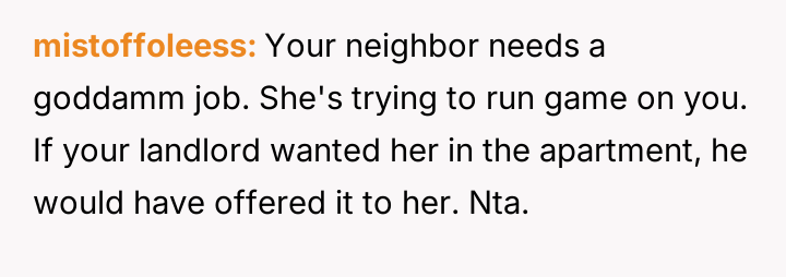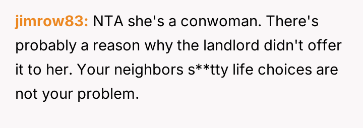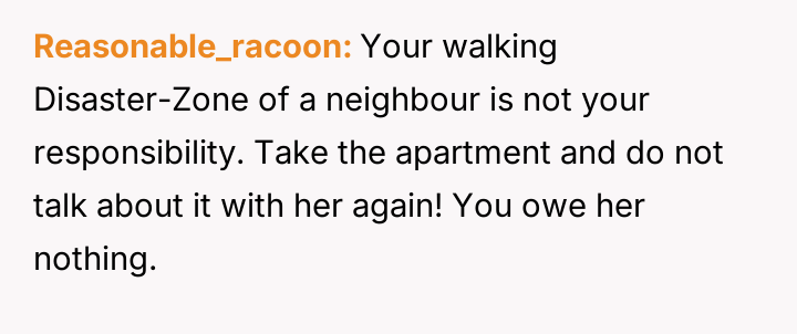 Given the immediate threat of homelessness for the OP versus the neighbor's pattern of ins**bility, is the OP justified in accepting the landlord's offer to secure their own housing, or does a moral obligation exist to yield the apartment to the neighbor who has three children and no other apparent options?