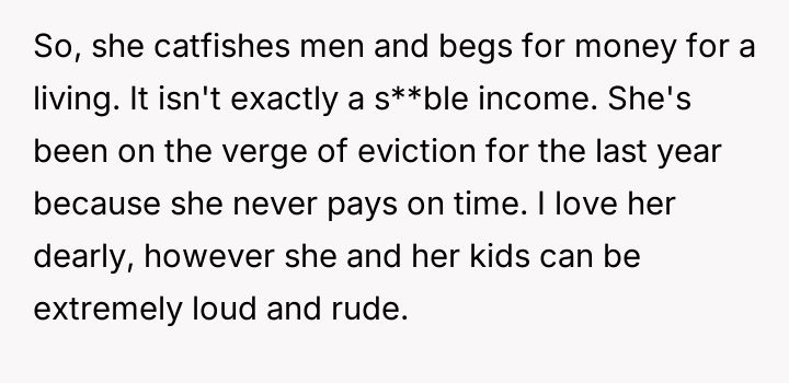 Next door, her neighbor’s chaotic life spills over in loud bursts and uns**ble income, a stark contrast to the quiet desperation she feels inside.