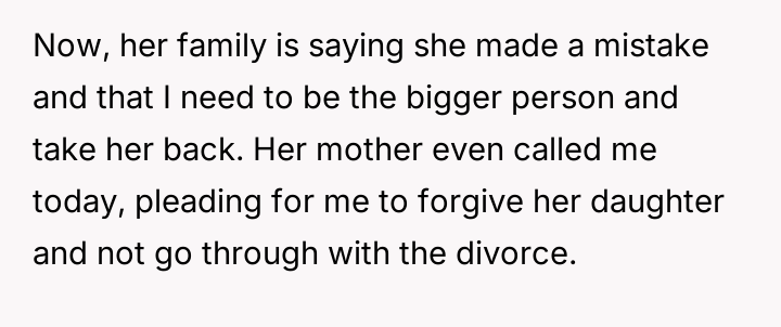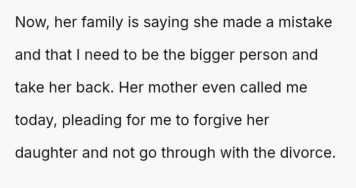 The core debate remains: Should the OP prioritize his personal integrity and the clear breach of marital contract by proceeding with the divorce, or should he yield to external emotional manipulation and family pressure to take back a partner who knowingly committed adultery and deceived him about paternity?
