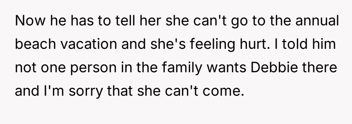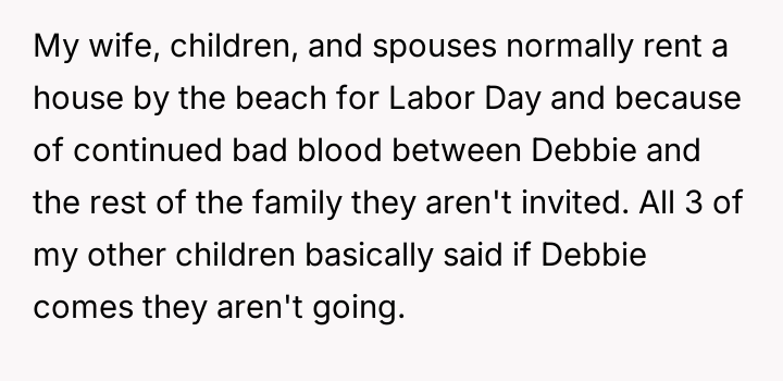 Given the severe rift caused by Debbie’s actions and the subsequent refusal by the wider family to include her, is the father justified in firmly supporting the family consensus against including Debbie in the upcoming beach vacation, even if it means Neil chooses to boycott the event with her?