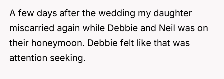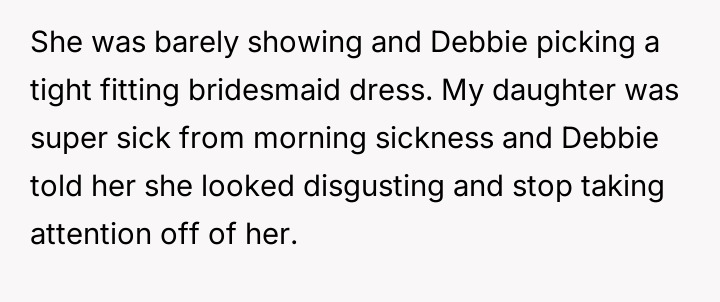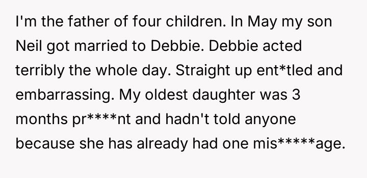Debbie’s ent*tled behavior cast a shadow over the family’s happiness, especially towards the father’s eldest daughter, who was quietly battling the vulnerability of early pregnancy and the weight of past loss.