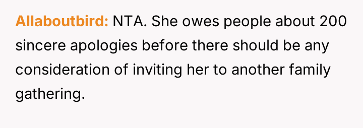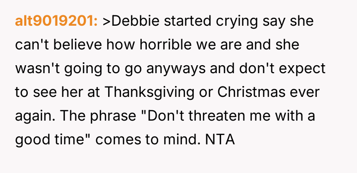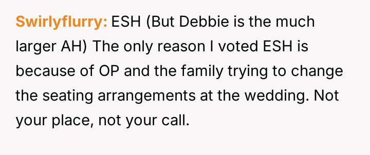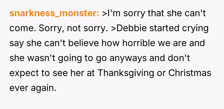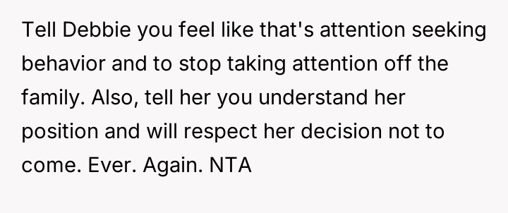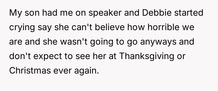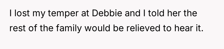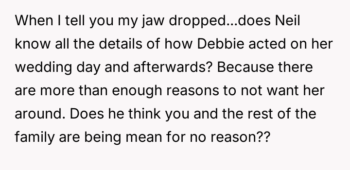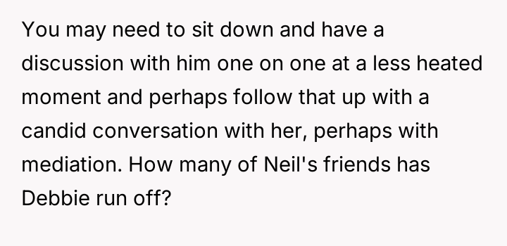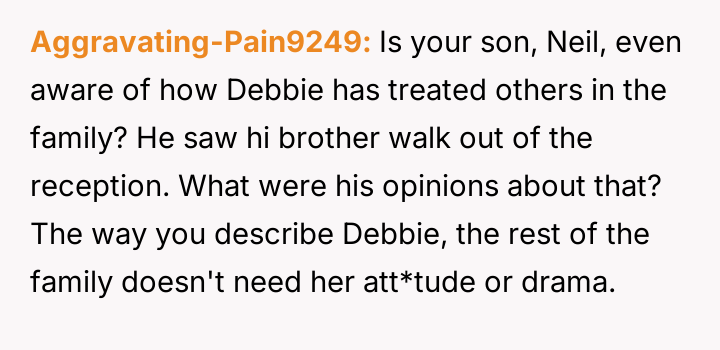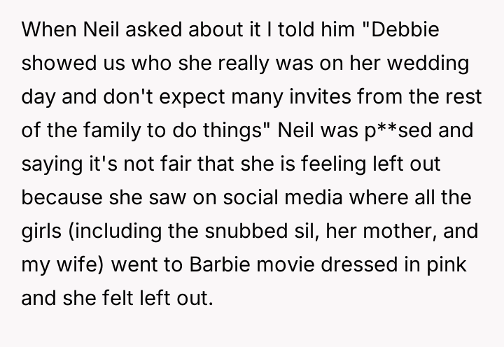 The central conflict stems from Debbie's perceived ent*tlement and hurtful actions, which led to immediate social consequences, such as exclusion from family events, and escalating tensions that have now resulted in Neil and Debbie cu***ng themselves off from most future family gatherings.