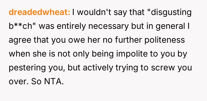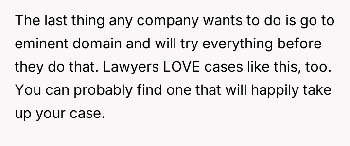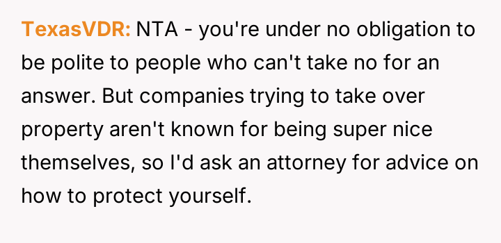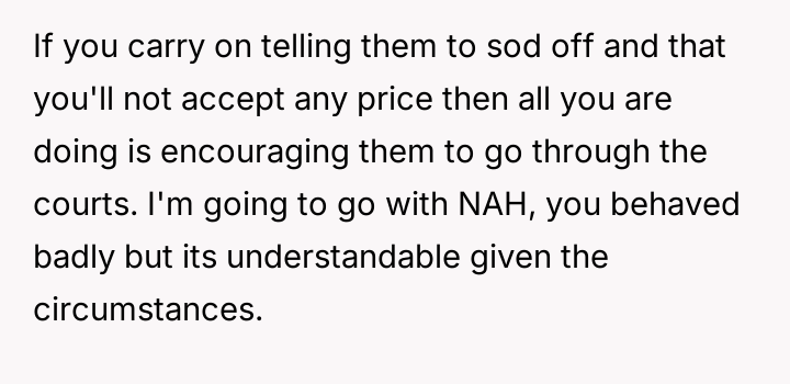 Given the extreme pressure applied by the company and the OP's highly emotional reaction, the core question remains: Is it justifiable to use aggressive, offensive language to defend one's property rights when facing relentless corporate pressure, or does this approach only escalate the conflict and potentially harm the OP's legal standing?