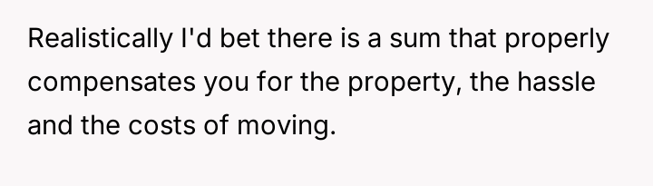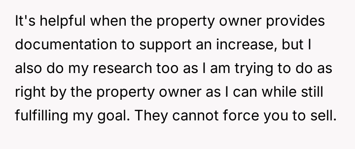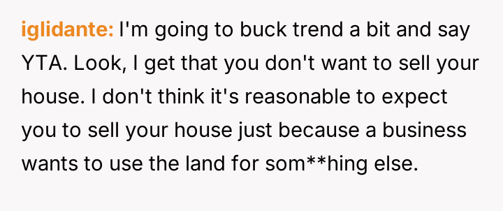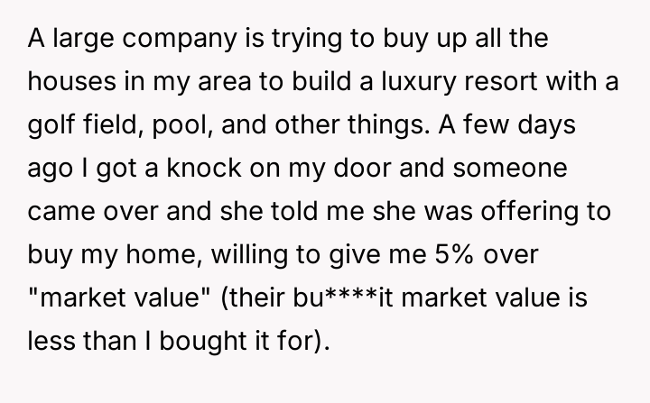 The central conflict is the OP's absolute refusal to sell versus the company's persistent, high-pressure offers and implied threats of future legal action.
