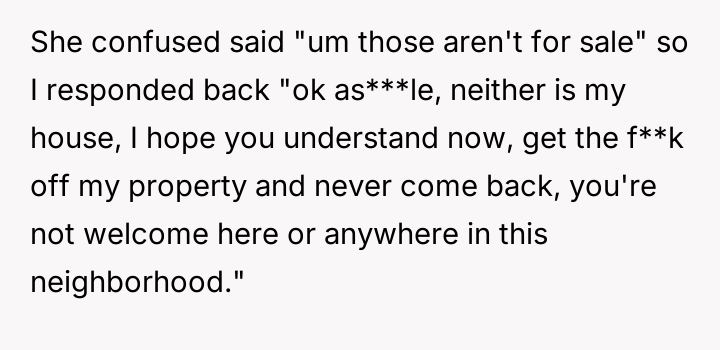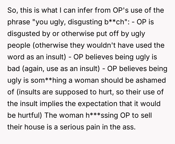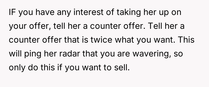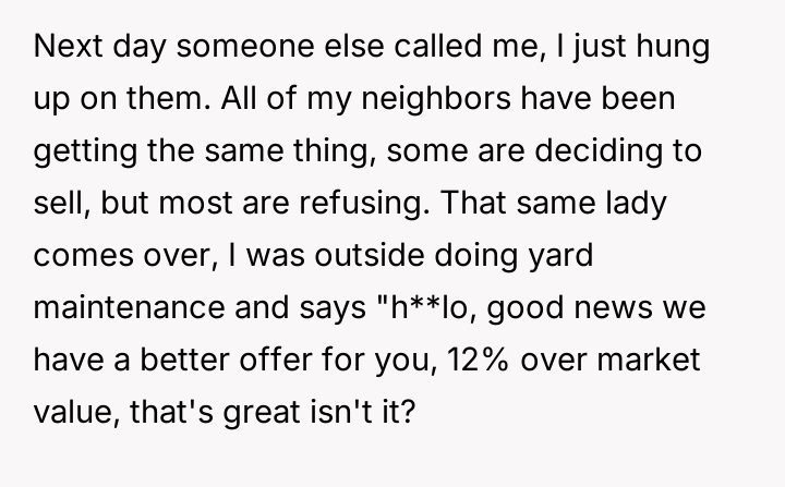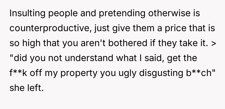 The original poster (OP) strongly desires to keep their home, directly confronting aggressive real estate tactics with escalating, vulgar, and confrontational responses to force the buyer to leave.