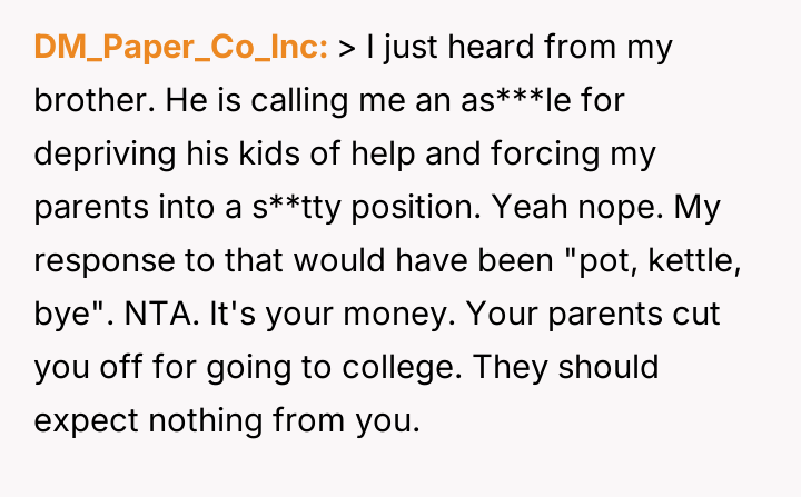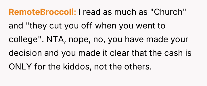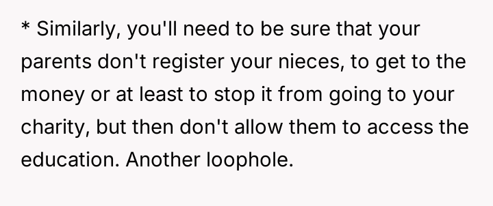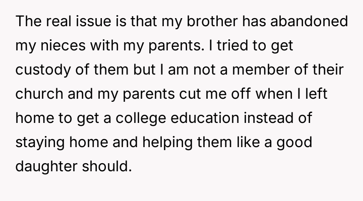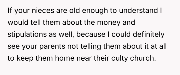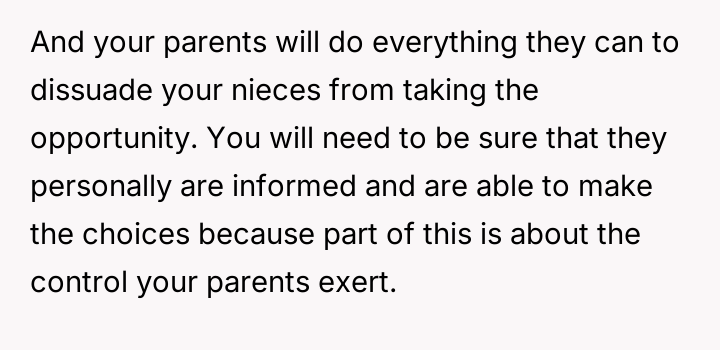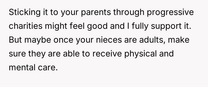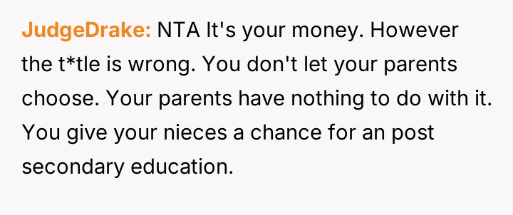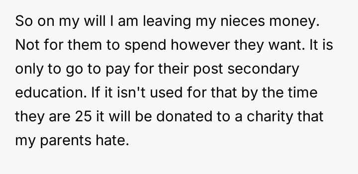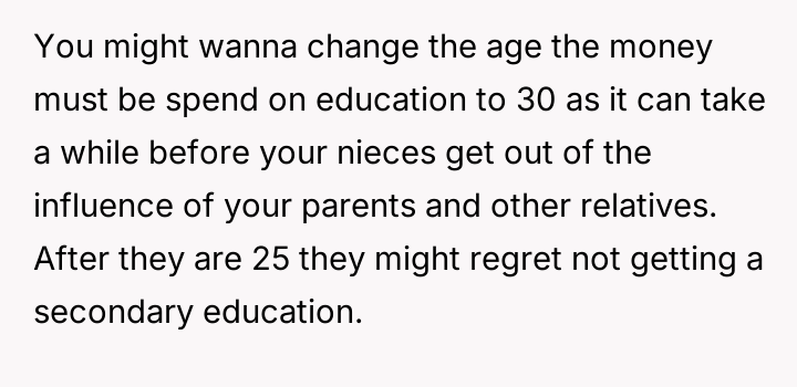 Given the family's history of enabling the brother and the parents' resistance to the OP taking custody, is the OP justified in using their final provisions to secure their nieces' educational future while simultaneously enforcing consequences on the irresponsible family members, or are they ethically obligated to provide unrestricted financial aid to the current caregivers (the parents)?