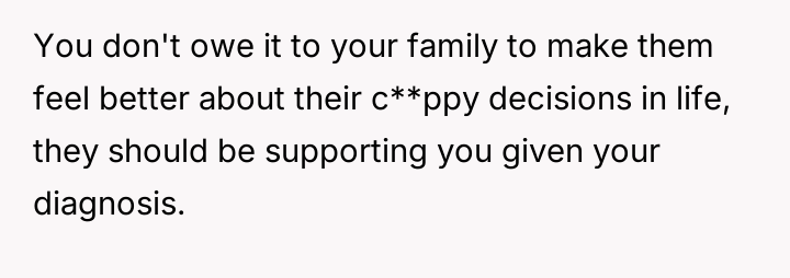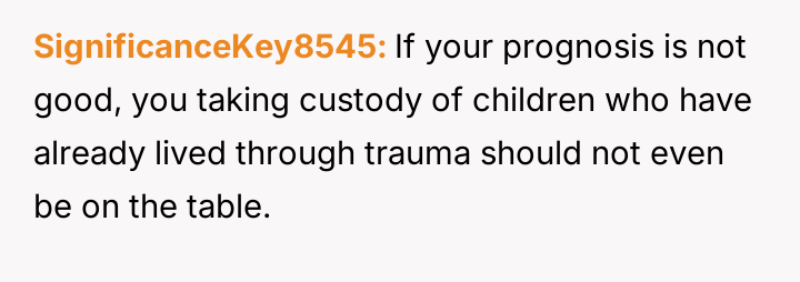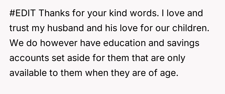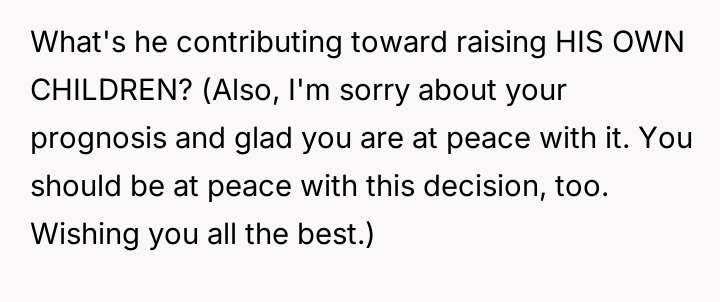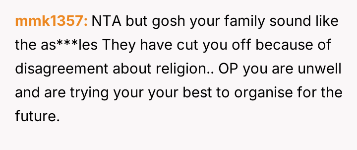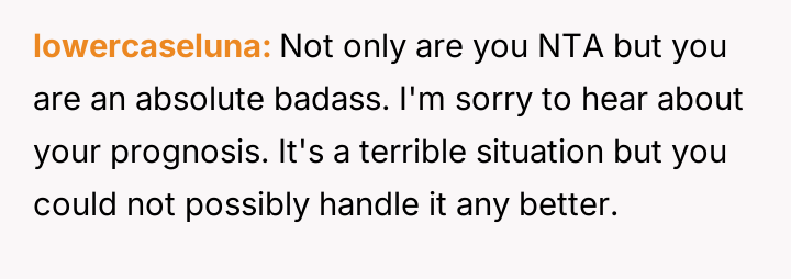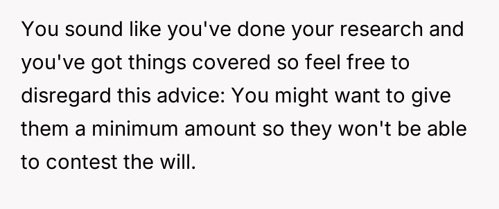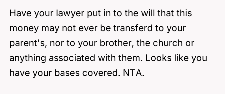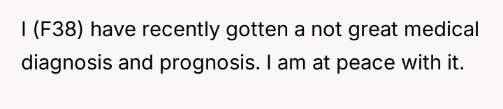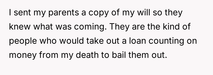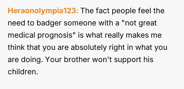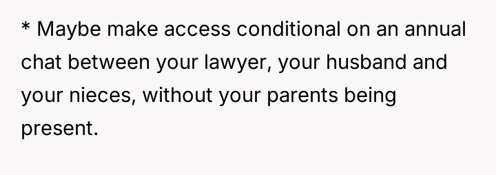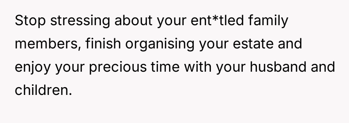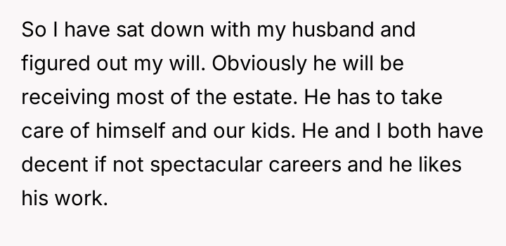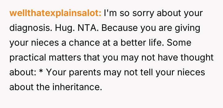 The individual facing a serious medical prognosis has finalized their will, prioritizing their husband and children while setting aside specific funds for their nieces' education, explicitly bypassing their parents and problematic brother.