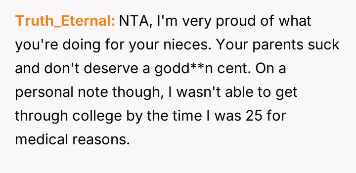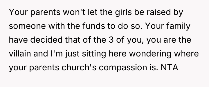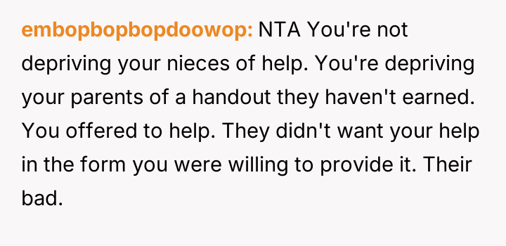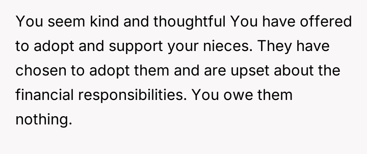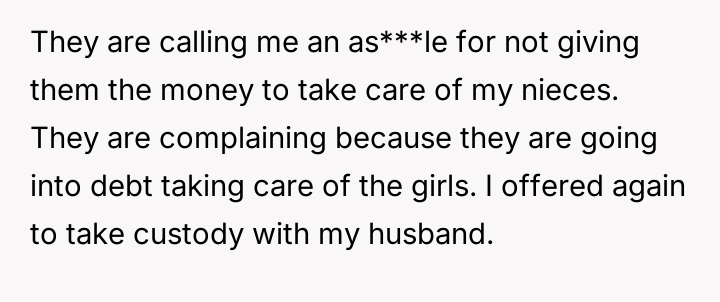 The central conflict arises from the OP's firm boundary setting—using their assets to support their nieces' future education under specific conditions—which directly clashes with the parents' expectation of receiving unconditional financial support to cover current caretaking expenses.