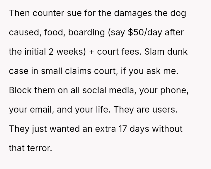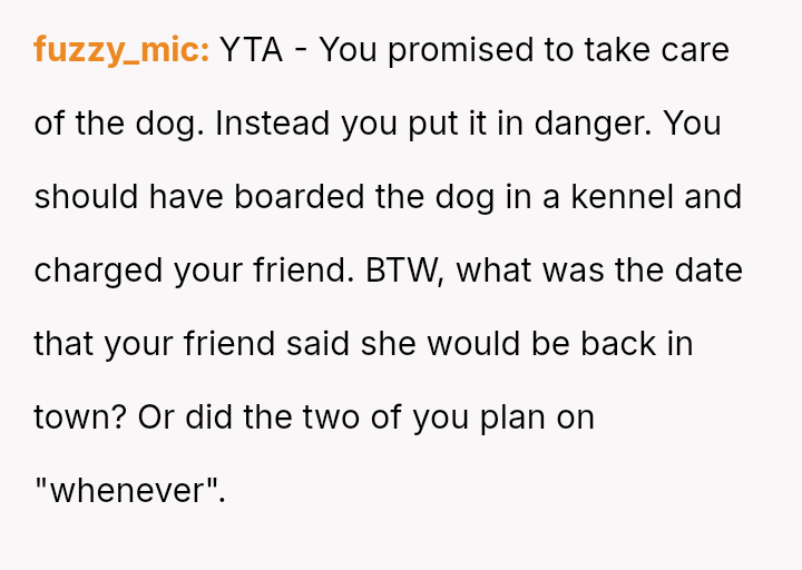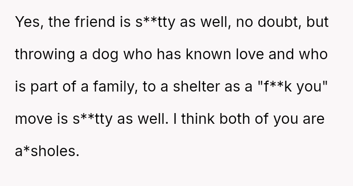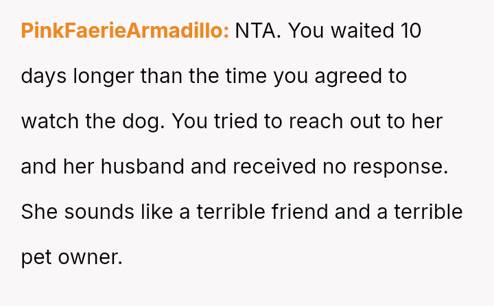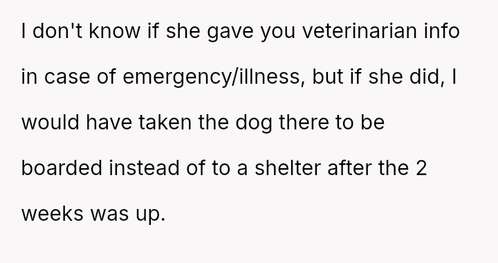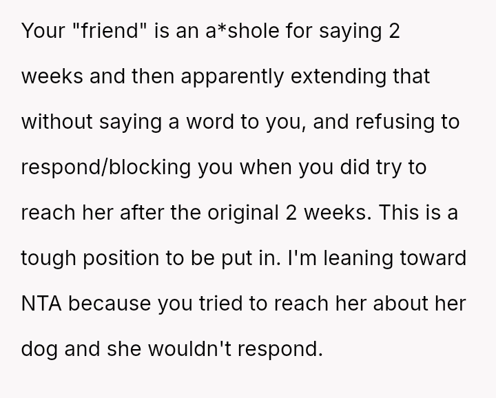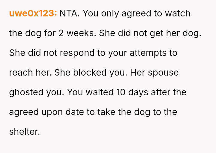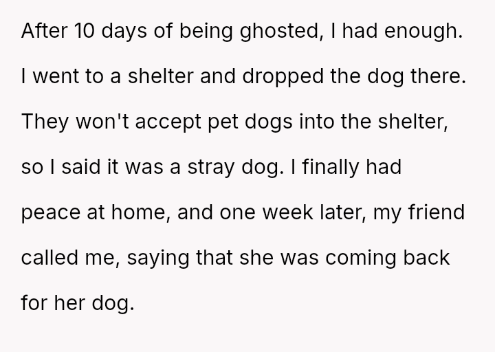 Given the friend's act of ghosting and the severe disruption caused by the pet, was the poster justified in surrendering the animal after waiting a significant, self-imposed d**dline, or did relinquishing the dog, regardless of the circumstances, v***ate the core trust es**blished when agreeing to the favor?