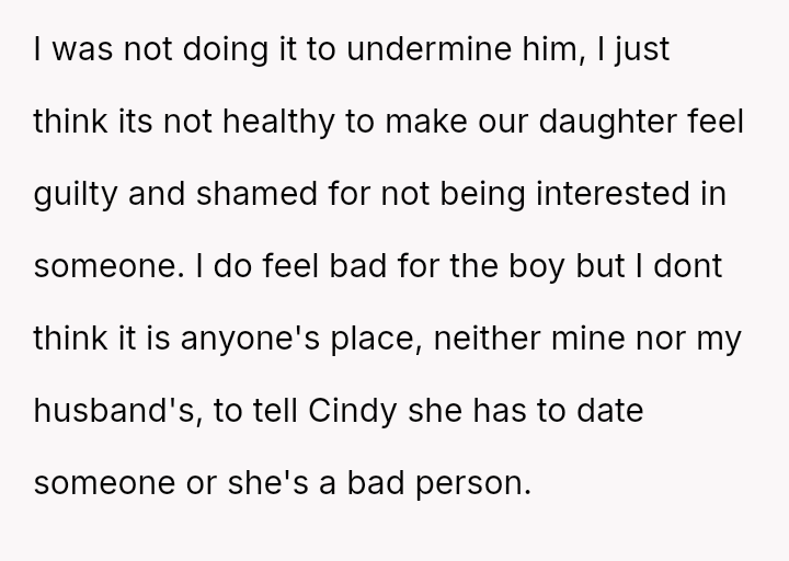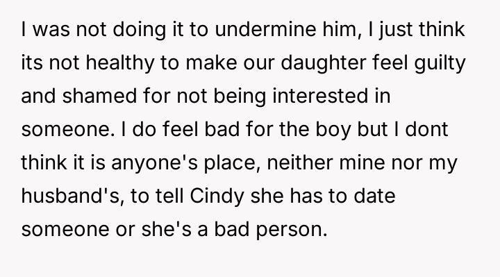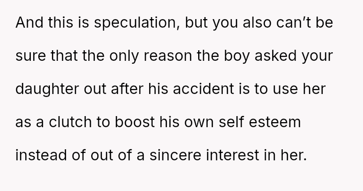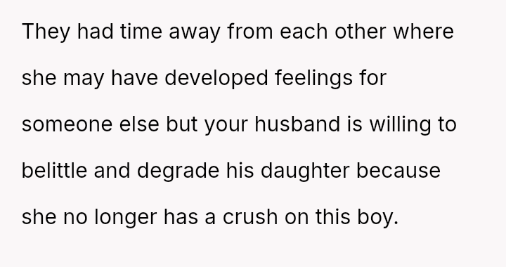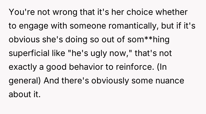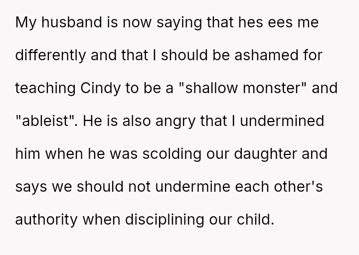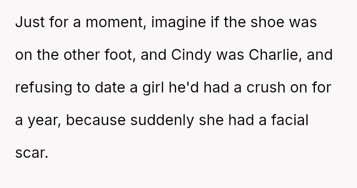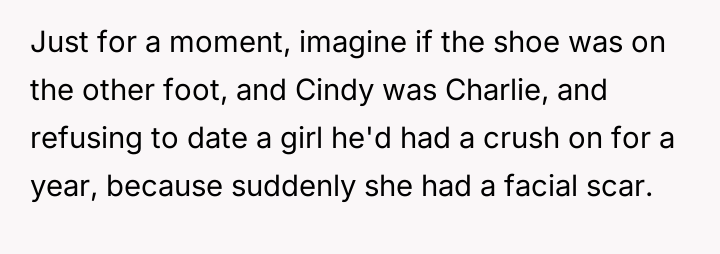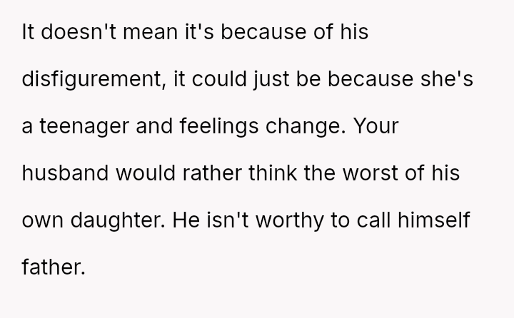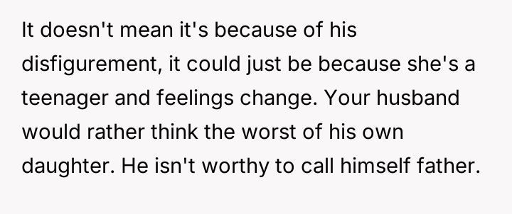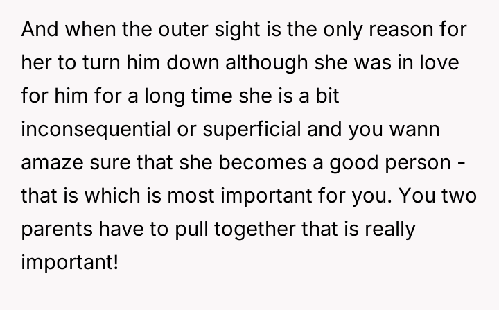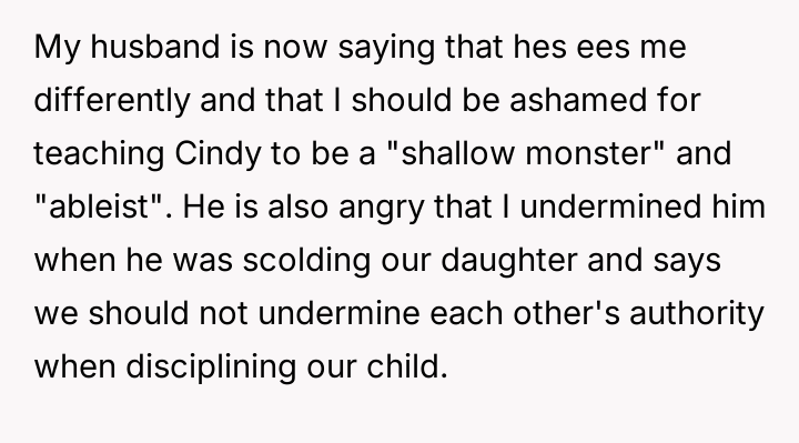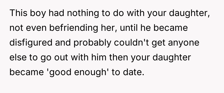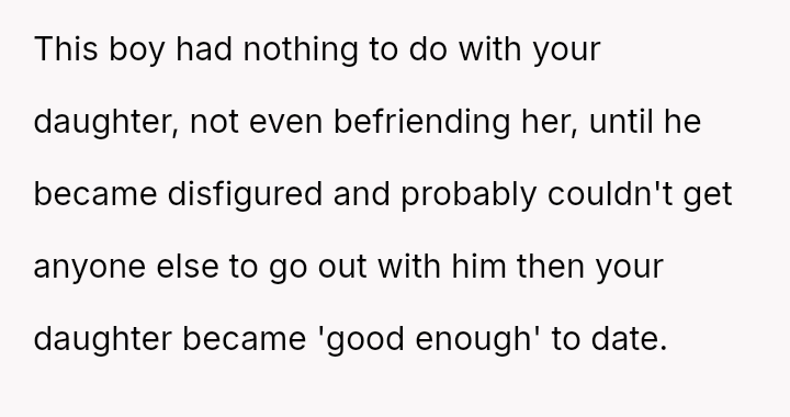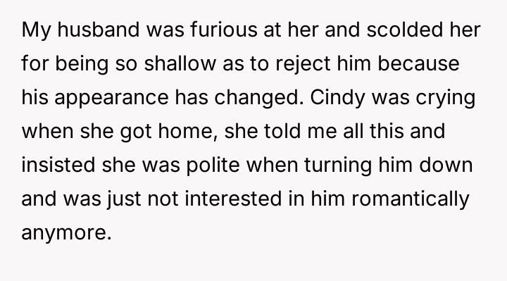 Conversely, the husband believes Cindy's rejection was cruel and shallow due to the boy's changed appearance, feeling the OP undermined his authority by defending their daughter's decision.