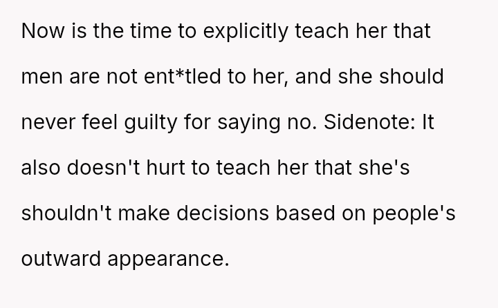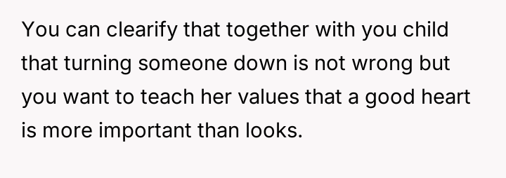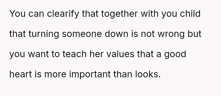 Given the fundamental disagreement on personal autonomy versus perceived social obligation in matters of romantic interest, should parents prioritize teaching their child that they must never reject someone based on appearance or circumstance, or should they strictly support their child's right to choose their romantic partners freely without guilt?