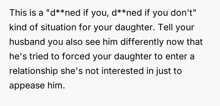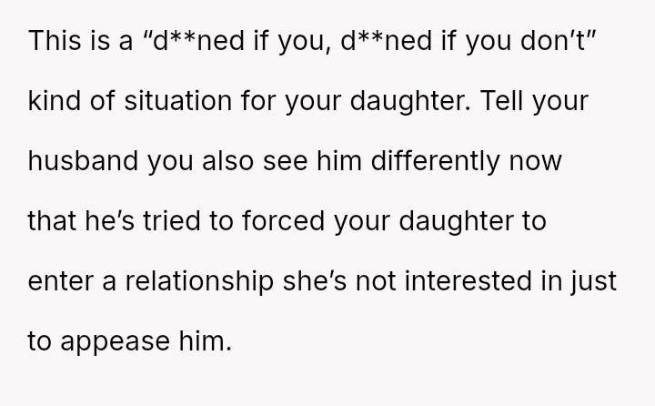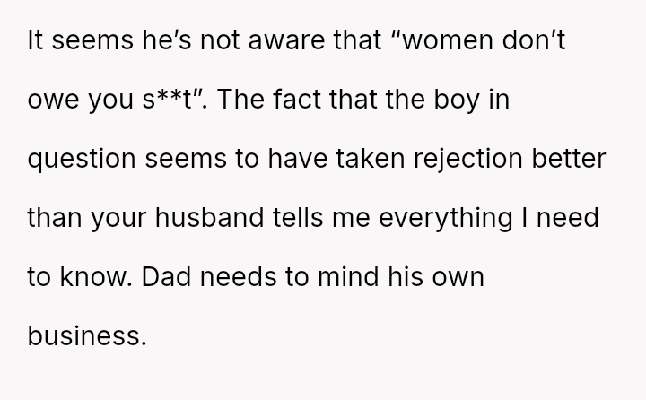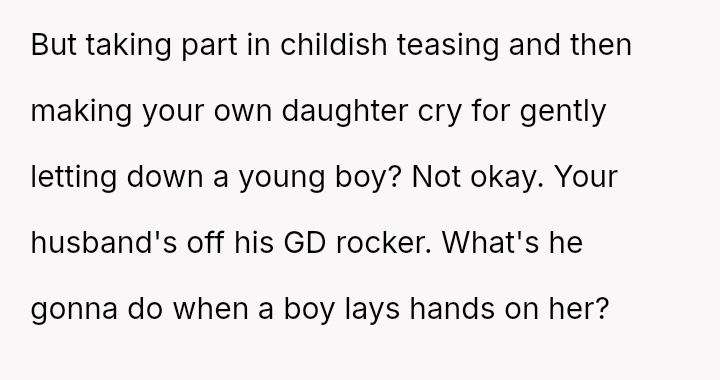 The original poster (OP) is in conflict with her husband over how their daughter, Cindy, should handle romantic rejection, particularly when the suitor has visible injuries.