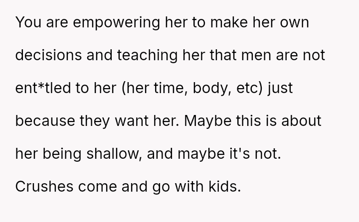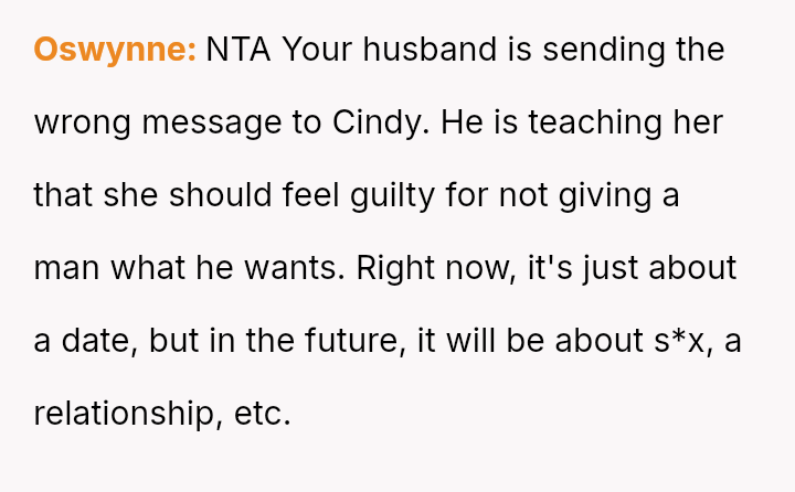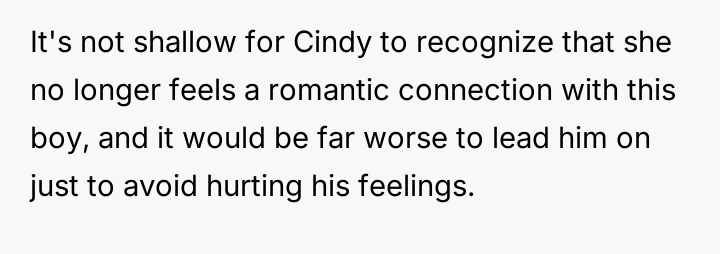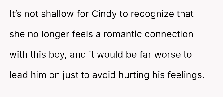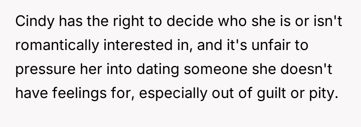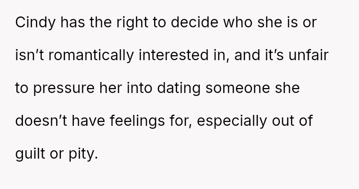 The OP supports Cindy's right to choose not to date someone she is not interested in, viewing the rejection as an exercise of personal autonomy.
