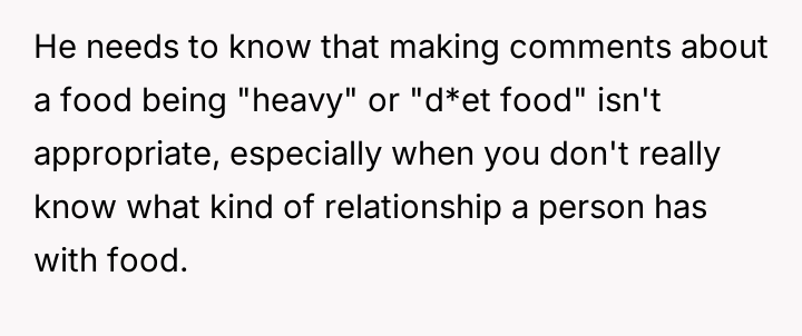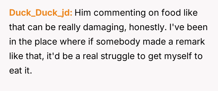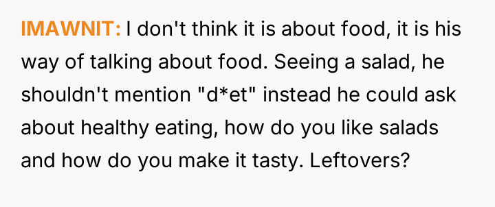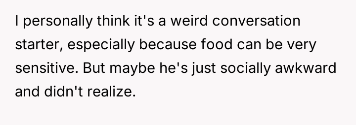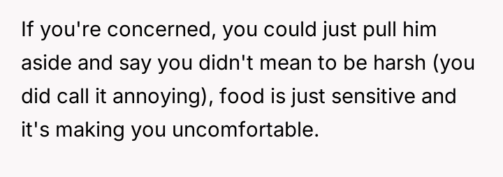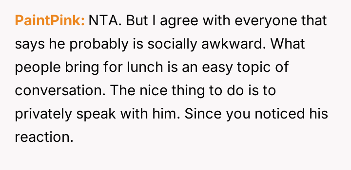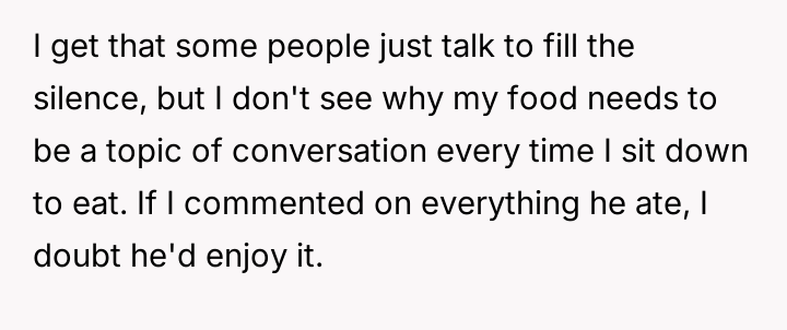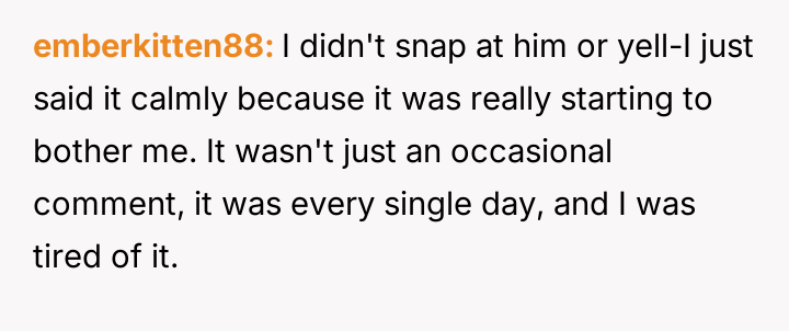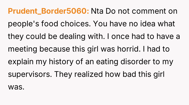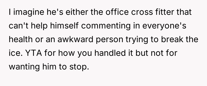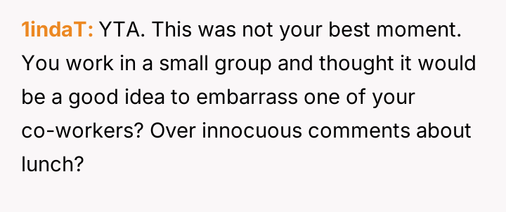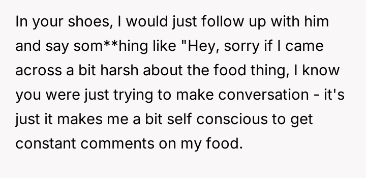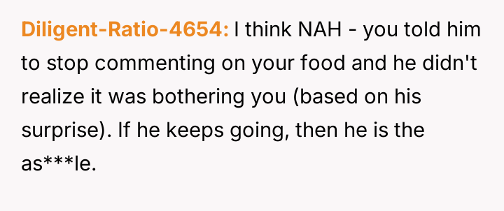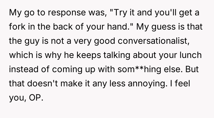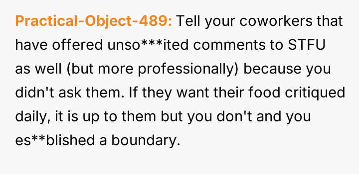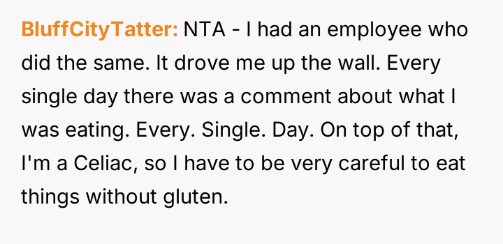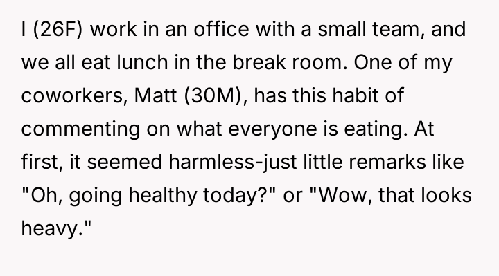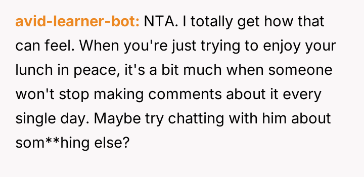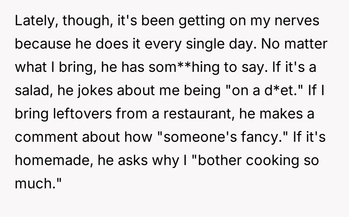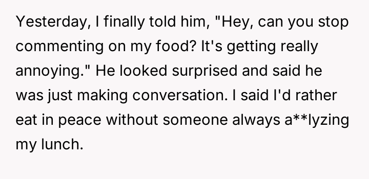 The original poster experienced escalating frustration due to a coworker's persistent, unso***ited comments about their daily lunch choices, leading to a direct confrontation where the boundary was explicitly set.