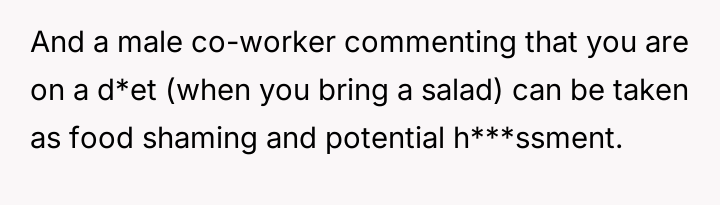 What began as harmless banter from Matt about a coworker’s food choices has slowly chipped away at her peace, turning daily meals into moments of discomfort and silent frustration.
