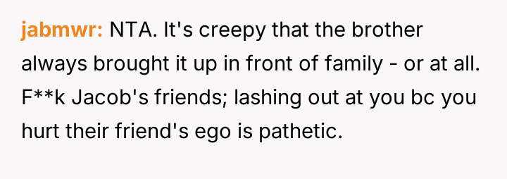 Given the ongoing pattern of disrespect from Jacob and the subsequent h***ssment from his social circle, the central question remains: Was the OP justified in her harsh public response to finally enforce a boundary, or did her reaction escalate the situation unnecessarily, thereby creating new conflicts within the extended family dynamic?