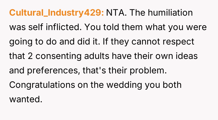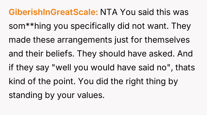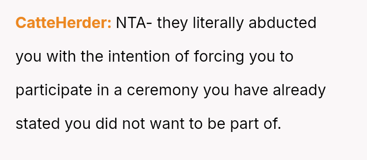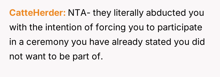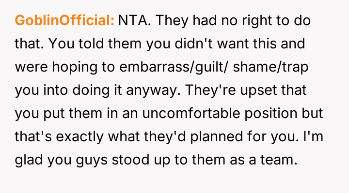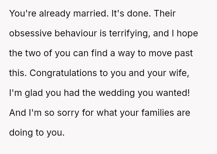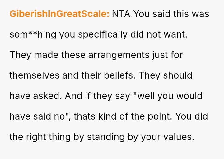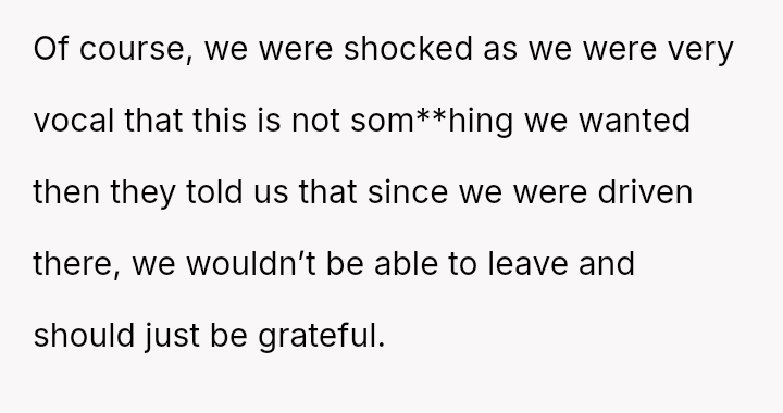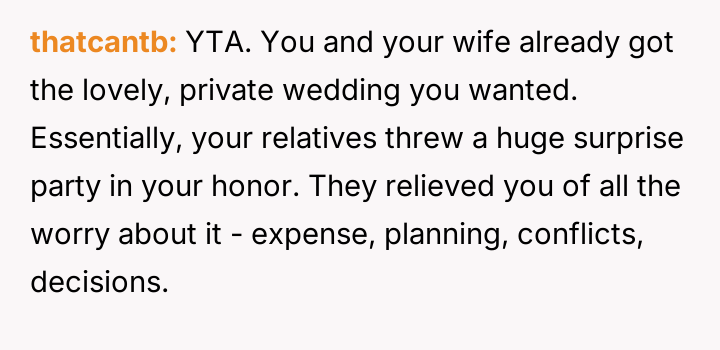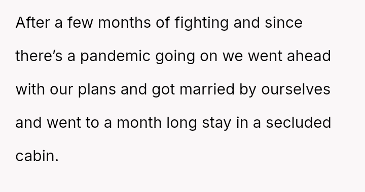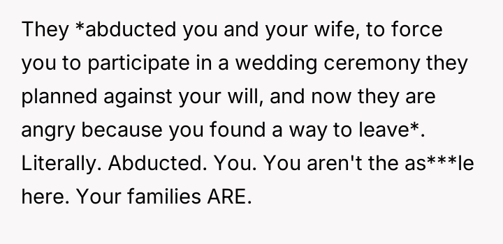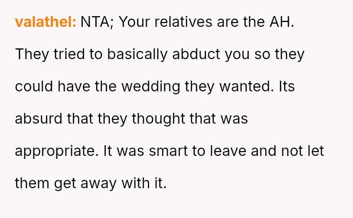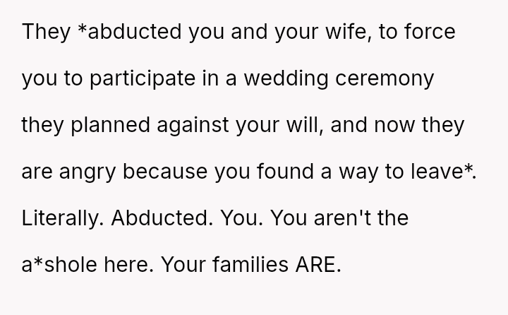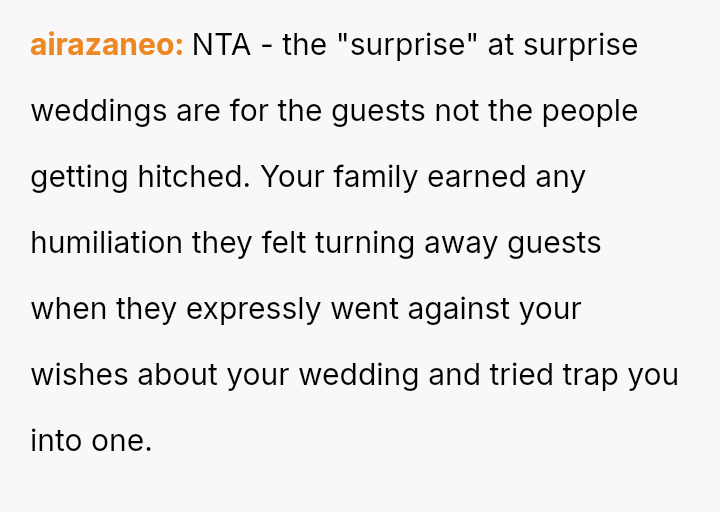 Given that the couple clearly communicated their wishes for a private ceremony, was their decision to leave the surprise event—after being told they could not depart—the appropriate response to a severe boundary v***ation, or were they wrong to reject the expensive, well-intentioned effort made by their families?