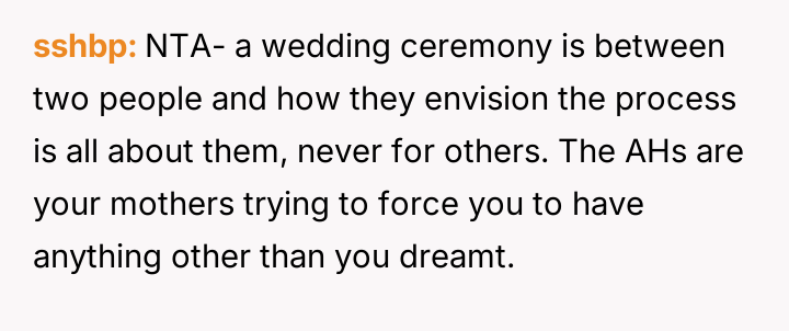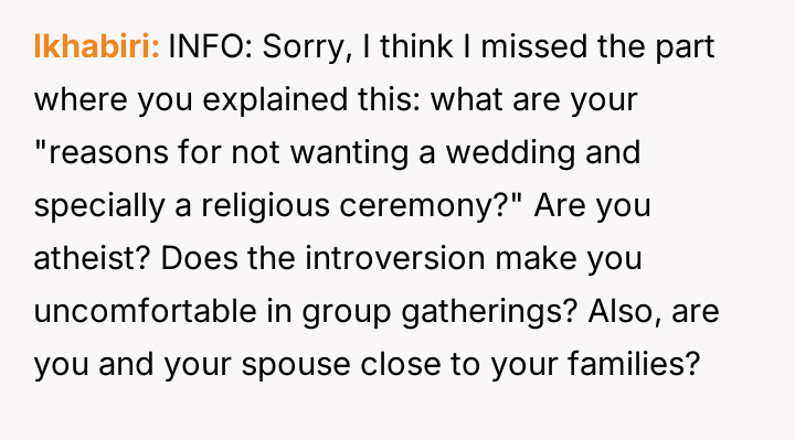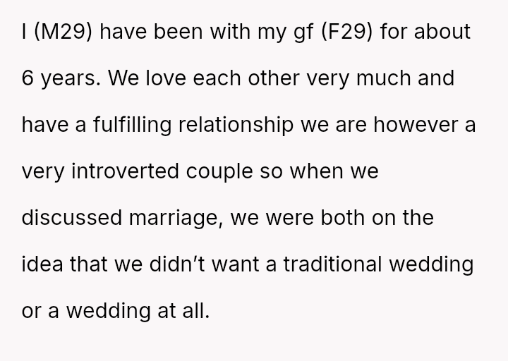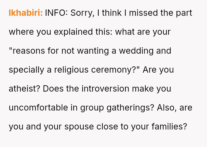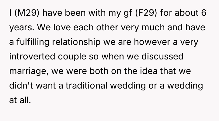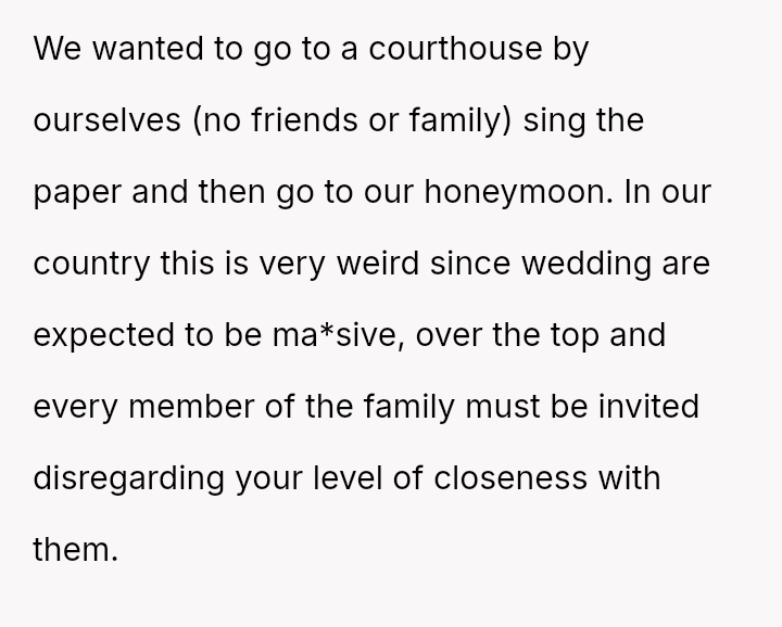 The original poster and his partner desired a private marriage based on their introverted preferences, leading to significant conflict with their families who expected a large, traditional, Catholic ceremony.