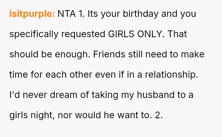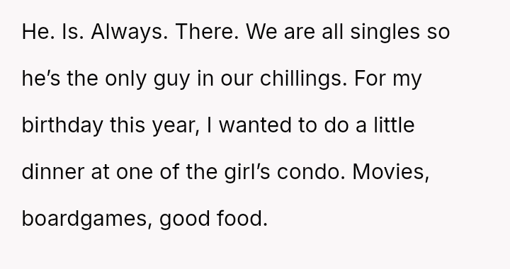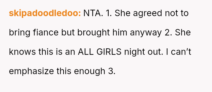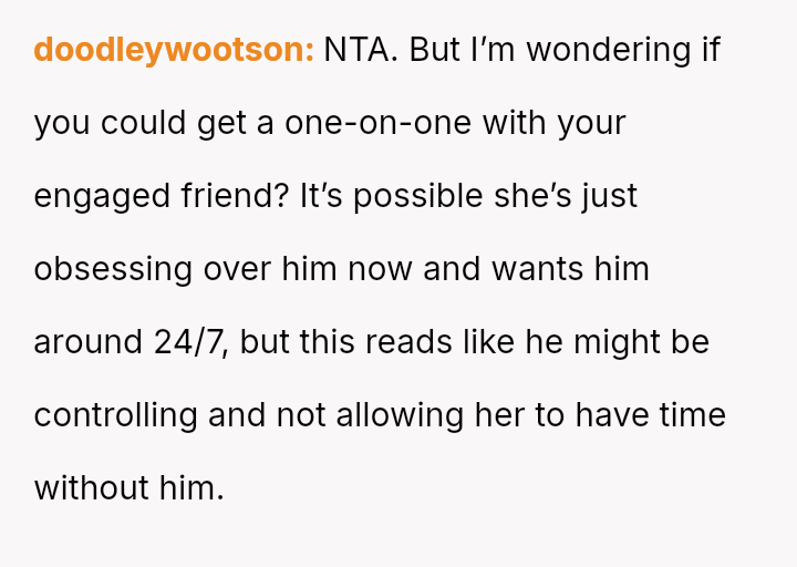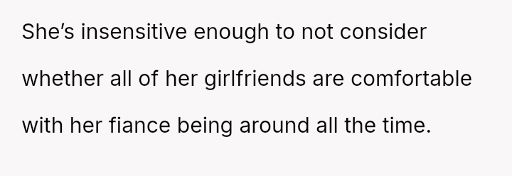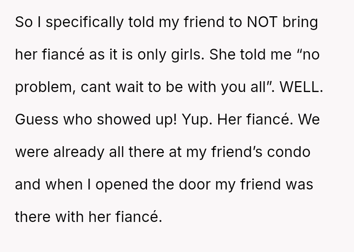 The original poster (OP) experienced significant frustration due to her friend consistently including her fiancé in events intended to be for the friend group alone, culminating in the fiancé's unexpected appearance at the OP's strictly planned girls-only birthday gathering.