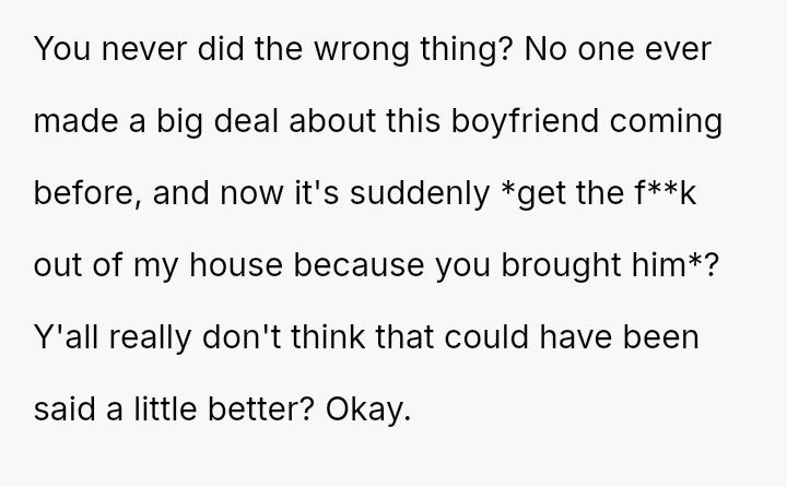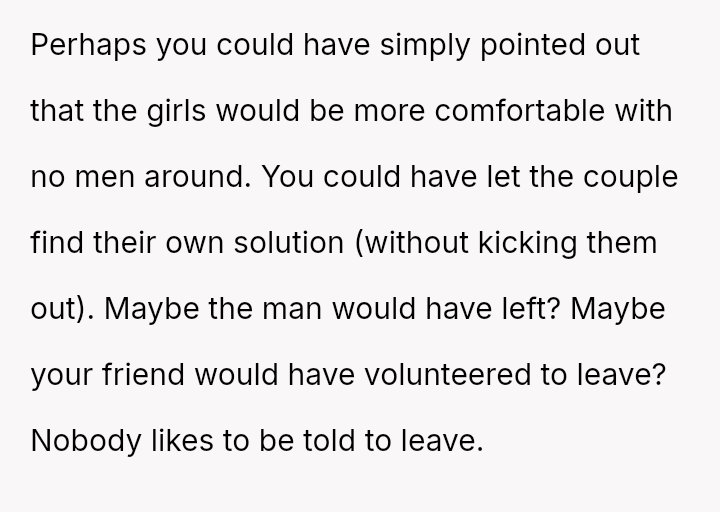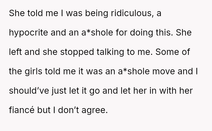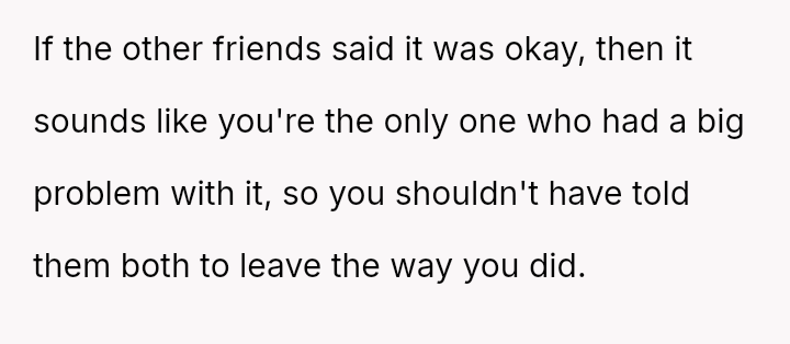The central conflict arose when the OP enforced her boundary by asking the couple to leave, leading to accusations of hypocrisy and an immediate breakdown in communication with her friend.