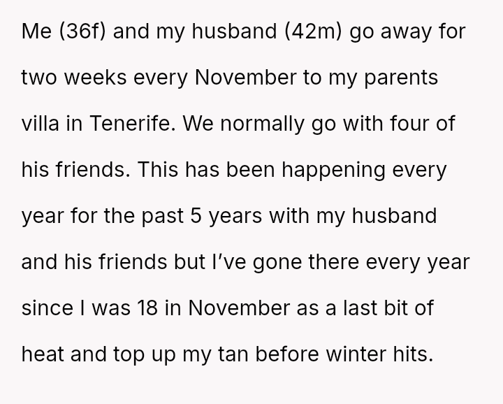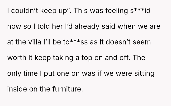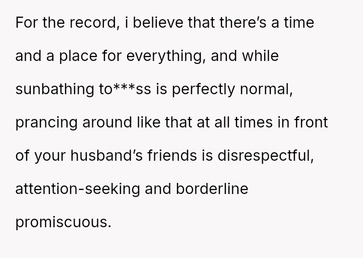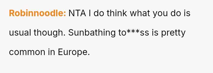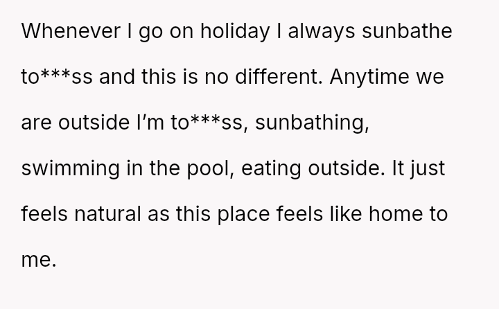 The original poster (OP) is standing firm in her right to behave naturally and comfortably in a familiar, private setting, which includes being to***ss while sunbathing at her parents' villa.
