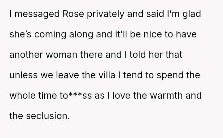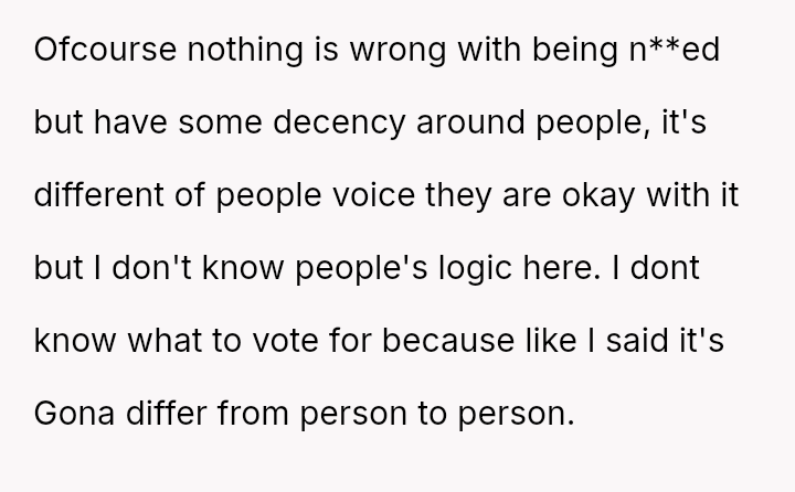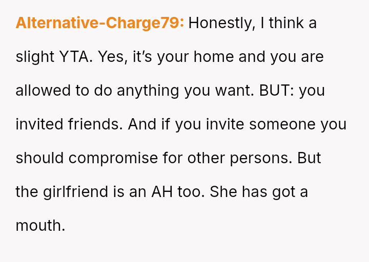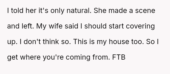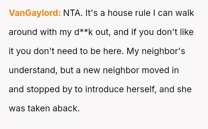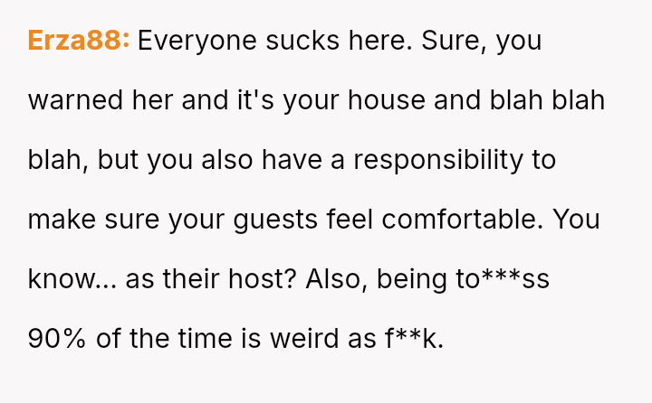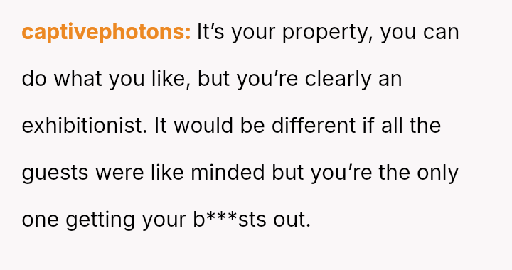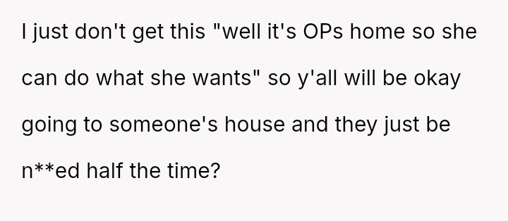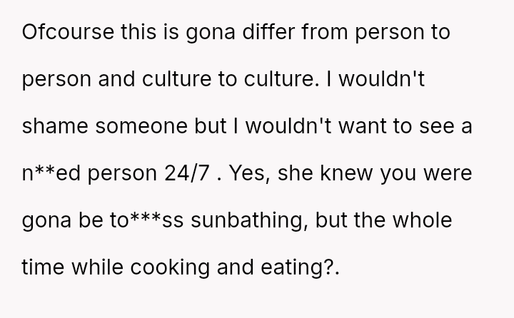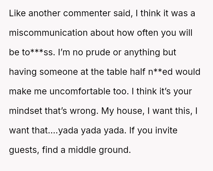 The core question for debate is whether an es**blished host's or long-time guest's habitual comfort level in a private holiday setting should yield to the sudden, unspoken discomfort of a new guest, even when the habit was disclosed beforehand?