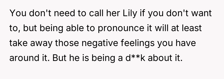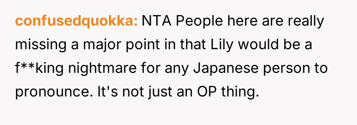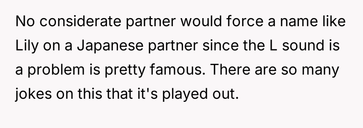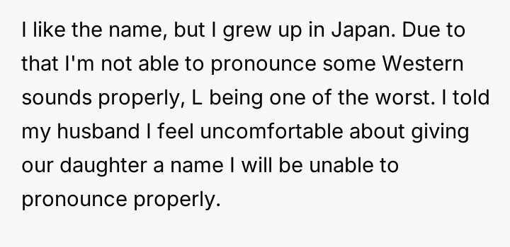The husband strongly favored the name Lily, a name he had always envisioned for a daughter. The OP expressed discomfort with Lily because, due to her Japanese upbringing, she has difficulty pronouncing the 'L' sound.
