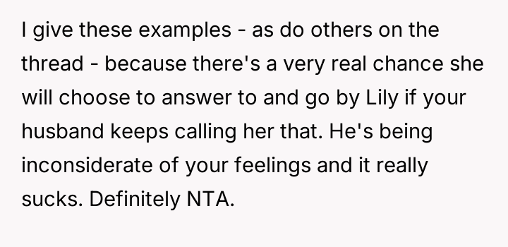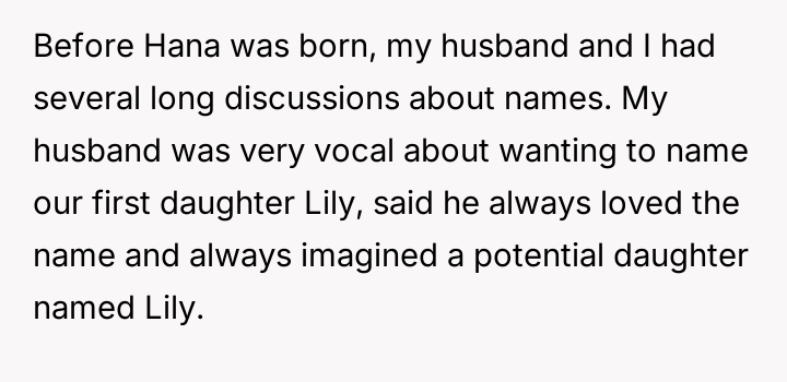 The original poster is currently feeling betrayed and disrespected because her husband is unilaterally using the name Lily for their daughter, despite a clear agreement to use Hana.