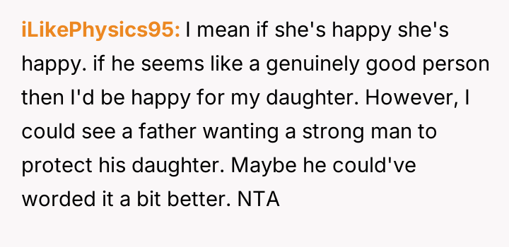 Should the parents prioritize their daughter's happiness with a genuinely caring partner, or should the father's concerns regarding traditional masculine traits dictate the acceptability of the relationship, even if it means dismissing a good person?