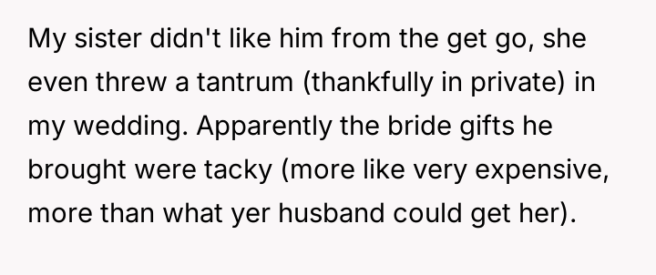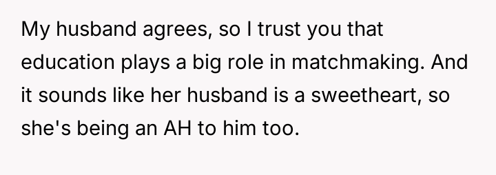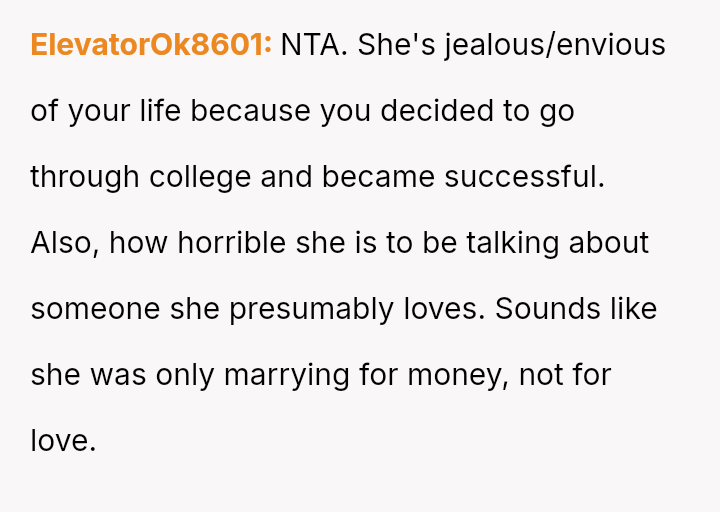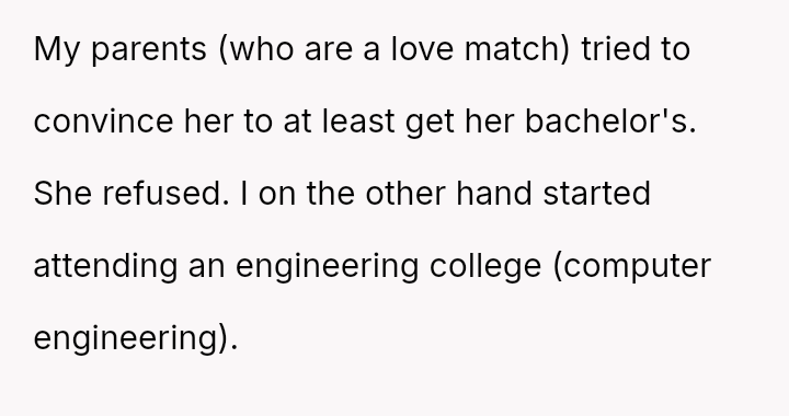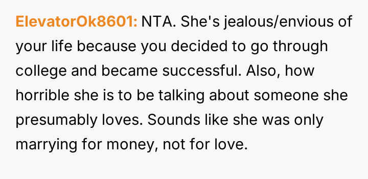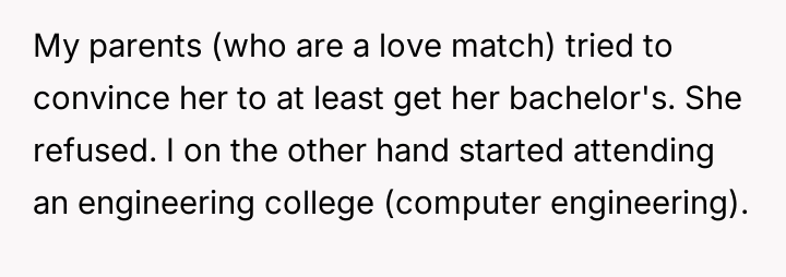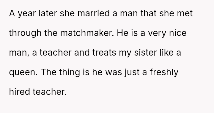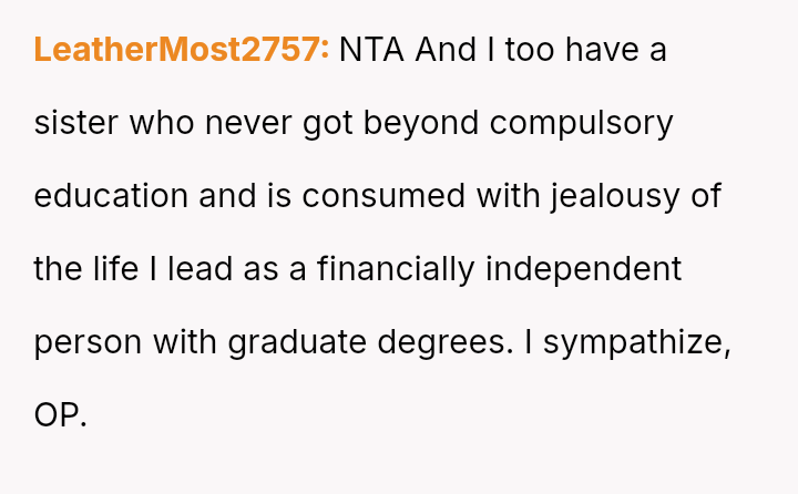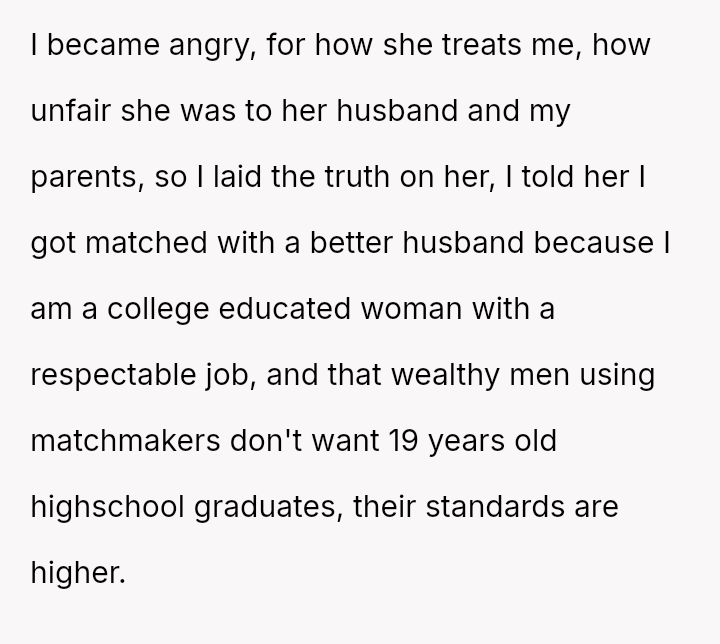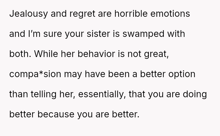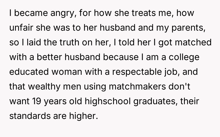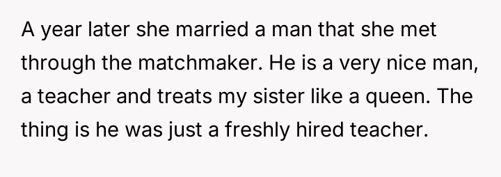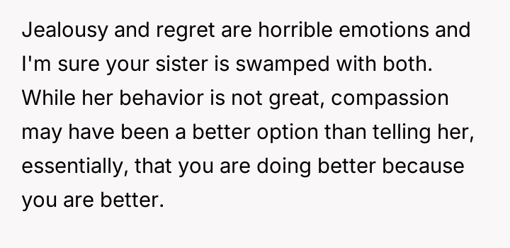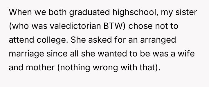 The core conflict lies in the sister's resentment over the perceived disparity in marital outcomes, which the OP addressed by directly linking her success to her higher education and professional career, essentially validating her choice over her sister's earlier decision to forego college for an arranged marriage.