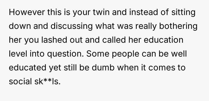 The original poster (OP) is facing a severe rift with her twin sister following a harsh confrontation about financial status and educational choices related to their respective marriages.