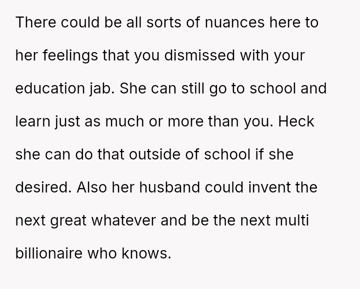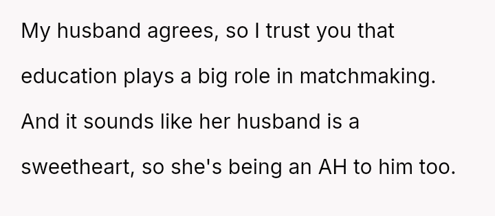 Did the OP cross a line by explicitly stating that her educational achievements directly resulted in a more financially advantageous marriage compared to her sister's choice, thereby invalidating her sister's life path?