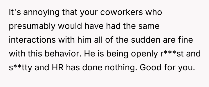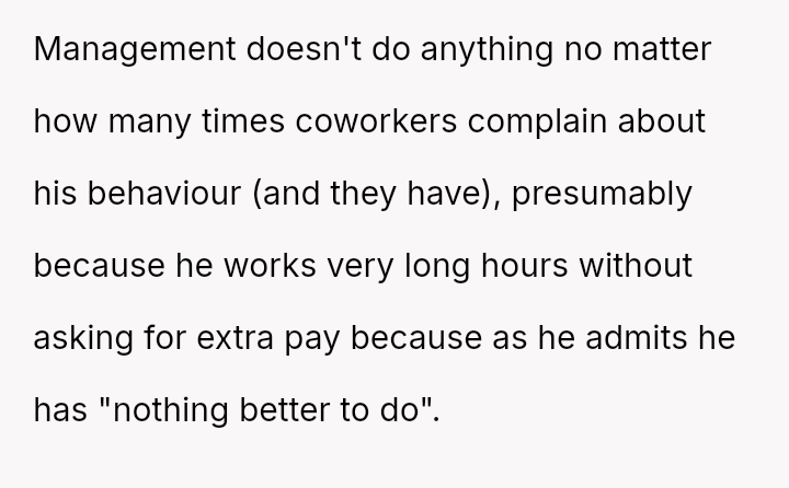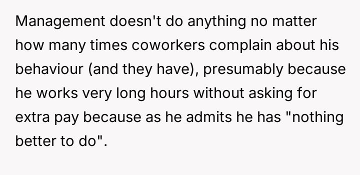 Despite repeated complaints, management turns a blind eye, tethered by his relentless hours and lonely existence, allowing his toxicity to fester unchecked.