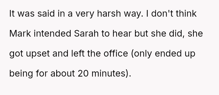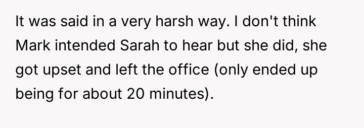 Amid this cold atmosphere, Sarah carries a weight far heavier than office stress—grieving the recent loss of her mother to cancer. Her pain is a silent undercurrent in the daily grind, a profound sorrow that contrasts sharply with Mark’s harshness.