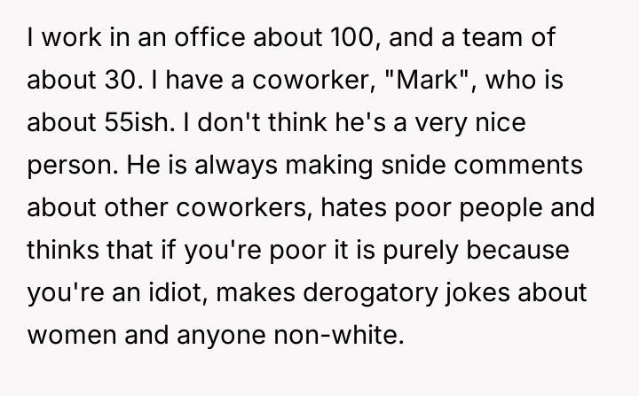 In a bustling office of a hundred, where a team of thirty navigates daily challenges, a shadow looms in the form of Mark, a man whose bitterness poisons the workplace.