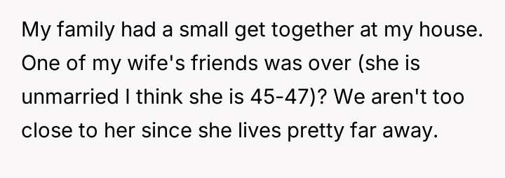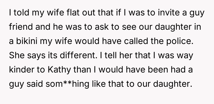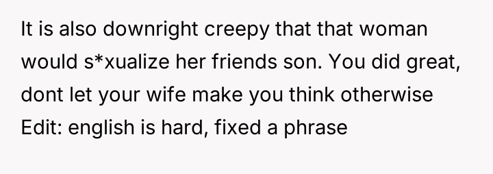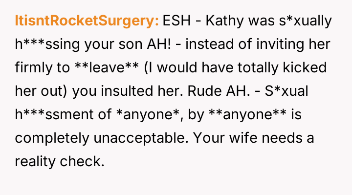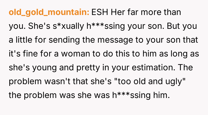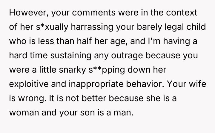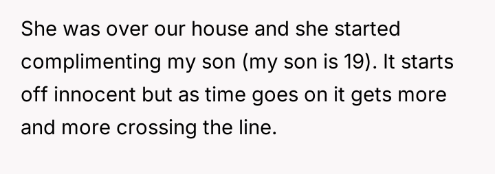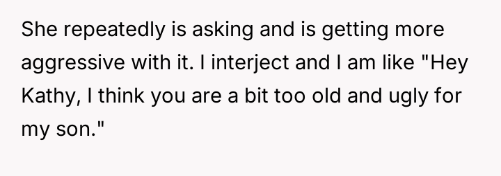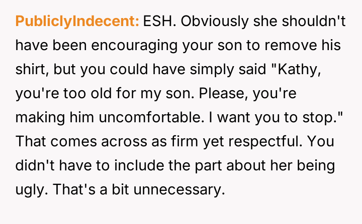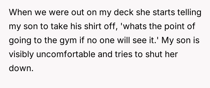 AITA for telling my wife’s friend she is too old and ugly after she repeatedly asked my 19-year-old son to take off his shirt? He was getting uncomfortable.