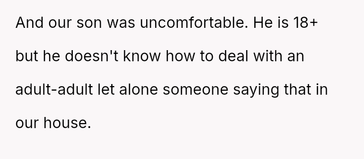 The original poster (OP) acted decisively to protect his son from inappropriate and persistent behavior by a guest, leading to conflict with his wife who favored a less confrontational approach.