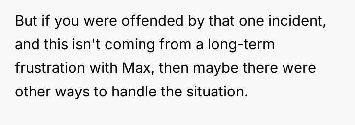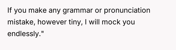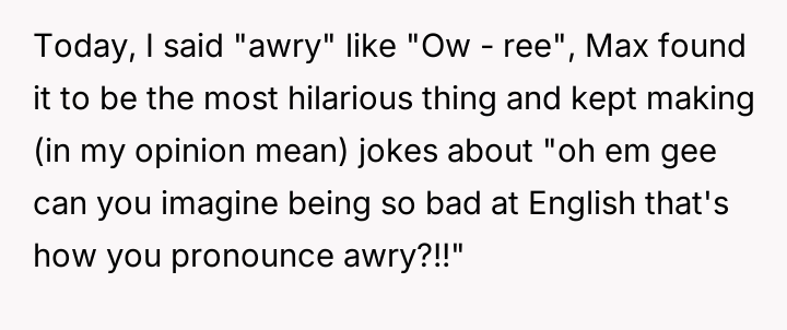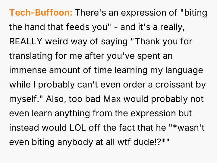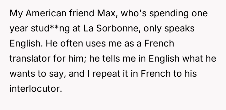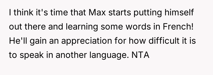 The OP reacted by setting a firm boundary, threatening to reverse the language dynamic and mock Max's French in return if the behavior continued.