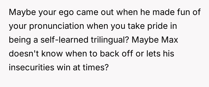 The Original Poster (OP) felt deeply disrespected and hurt when their friend, Max, mocked their English pronunciation after the OP had provided translation assistance.