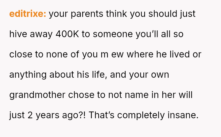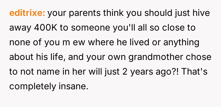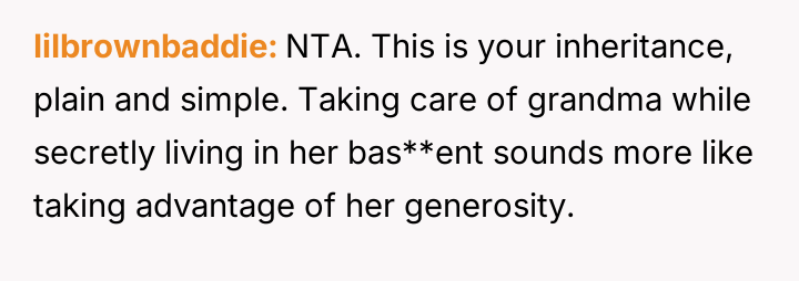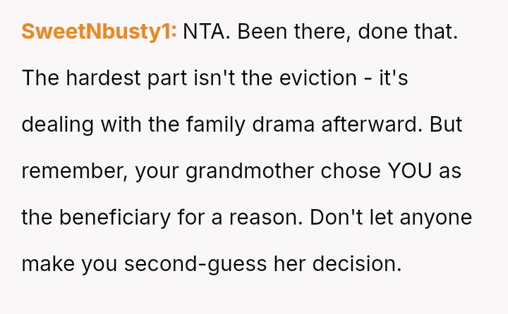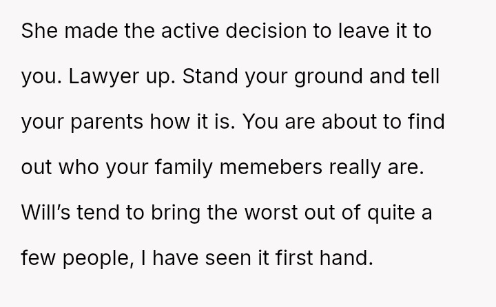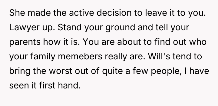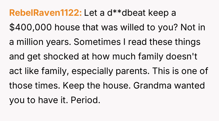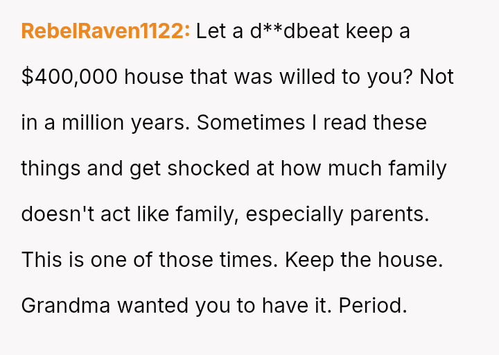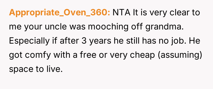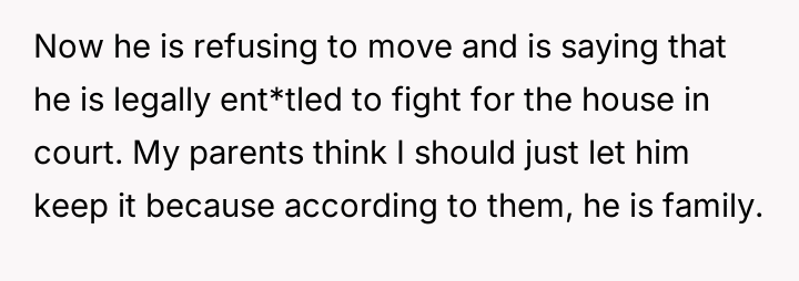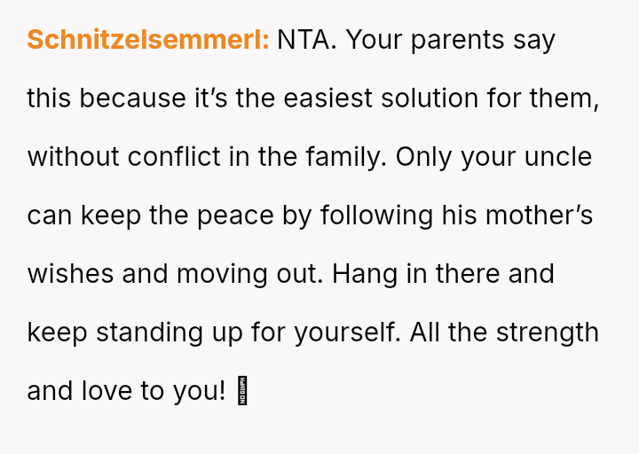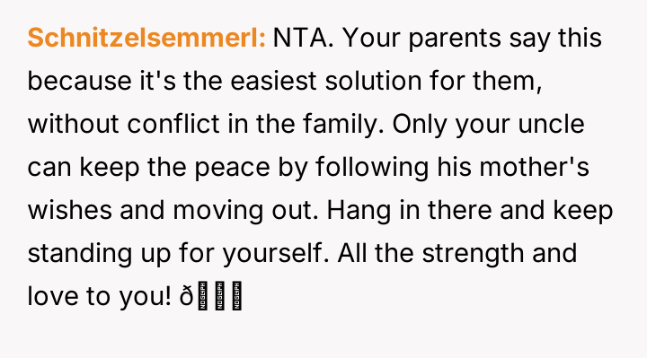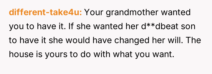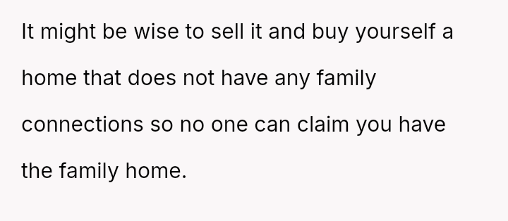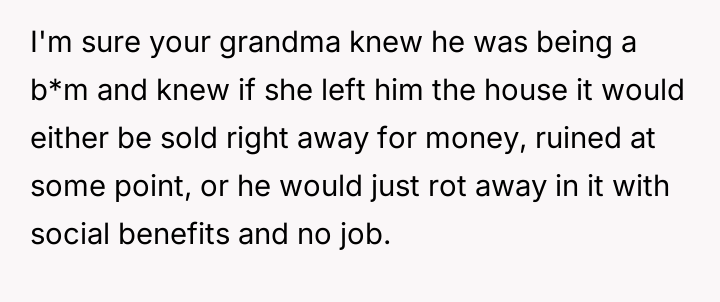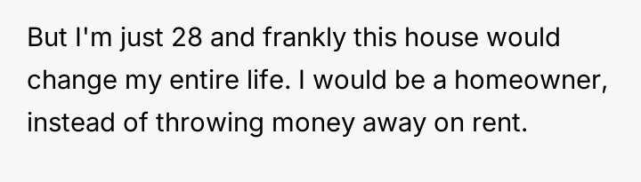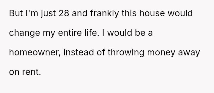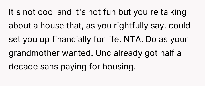 The OP is emotionally invested in securing the financial s**bility the inheritance offers, while simultaneously grappling with familial pressure to yield the property out of obligation to the uncle.