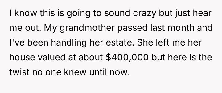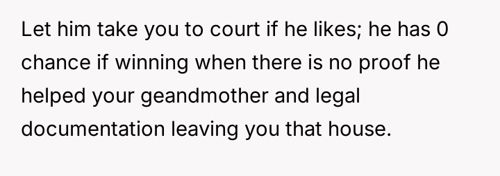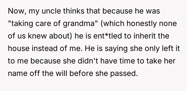 The original poster (OP) is facing a significant conflict where a recently inherited asset, a house, is being claimed by their uncle based on his past caretaking role, directly opposing the explicit terms of the grandmother's will.