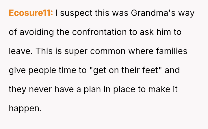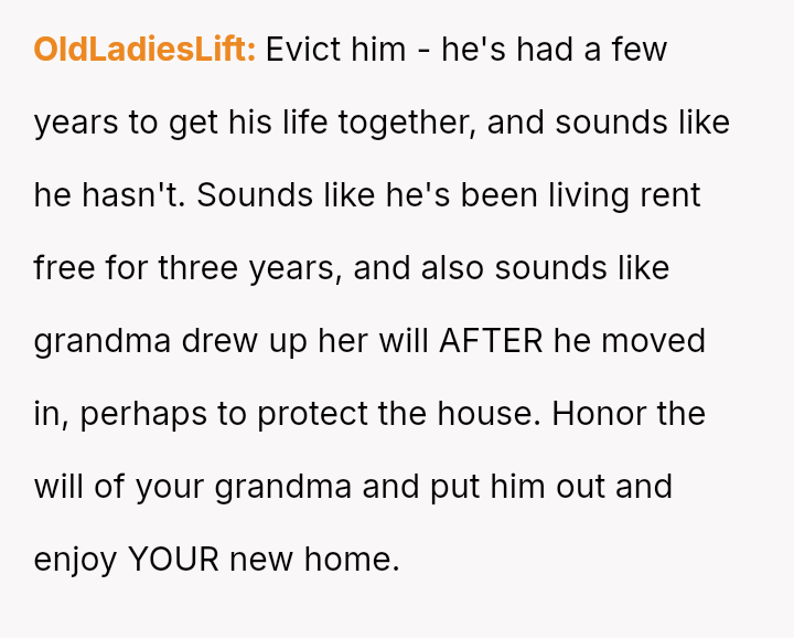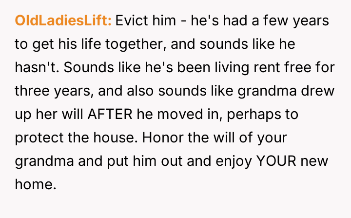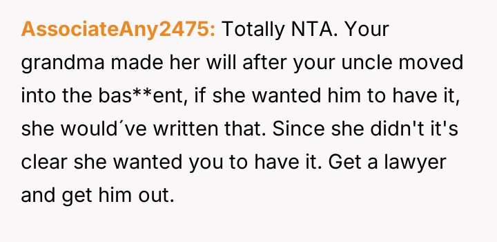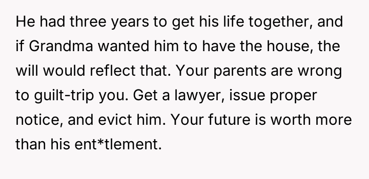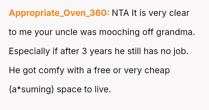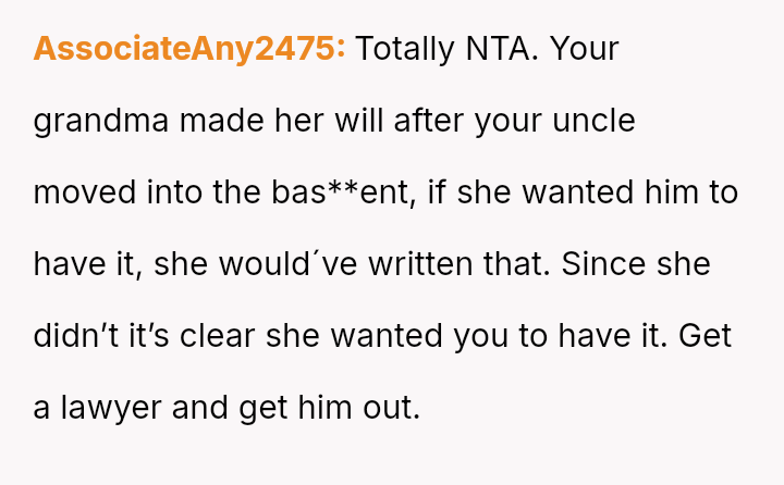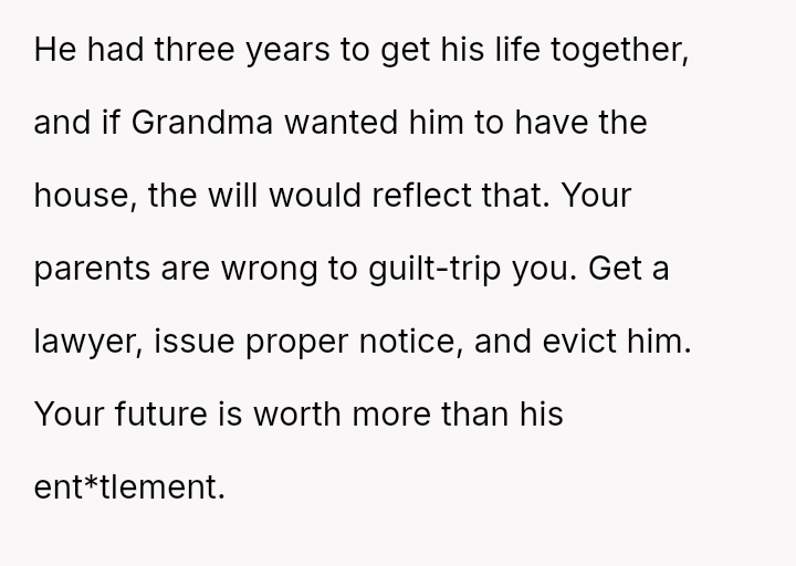 Given the grandmother's recent will and the uncle's unauthorized long-term residency, should the OP proceed with legal measures, such as eviction proceedings, to enforce the will's terms, or is the moral obligation to prioritize family unity and recognize the uncle's perceived contribution by allowing him to remain in the home?