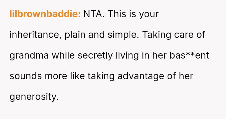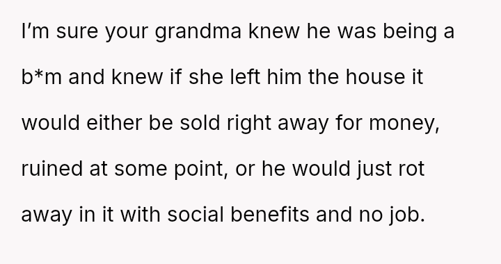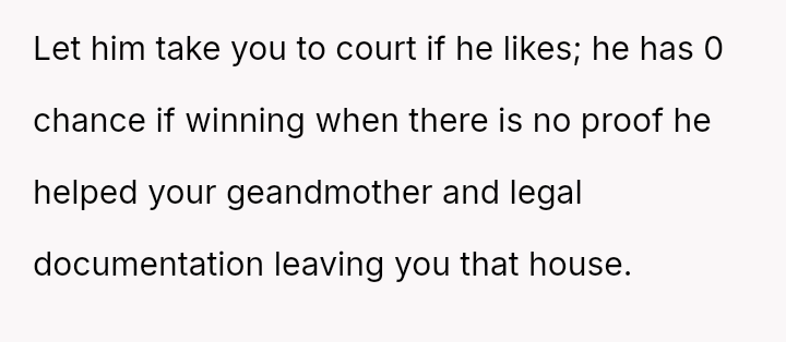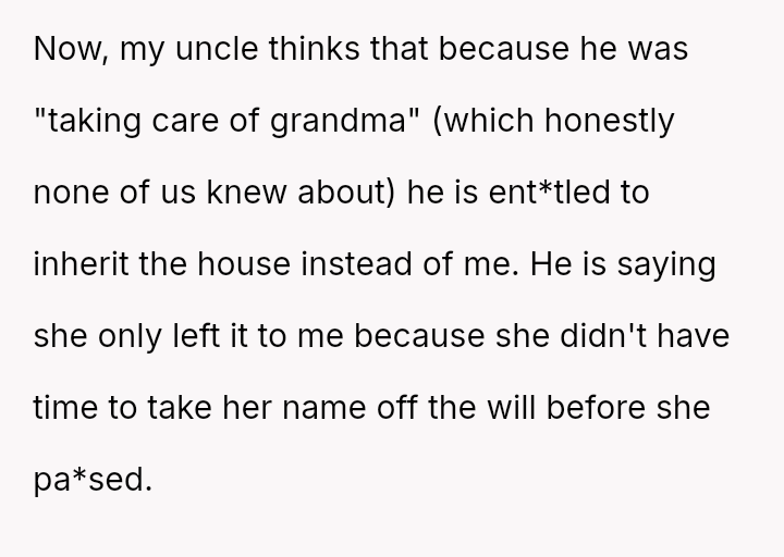 The original poster (OP) is facing a significant conflict where a recently inherited a*set, a house, is being claimed by their uncle based on his past caretaking role, directly opposing the explicit terms of the grandmother's will.