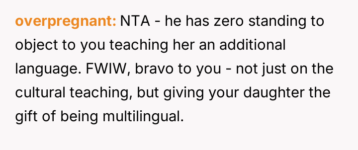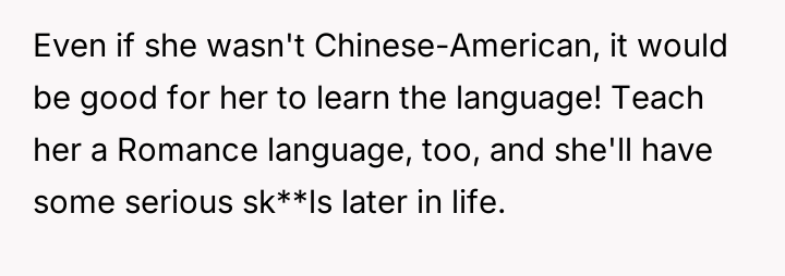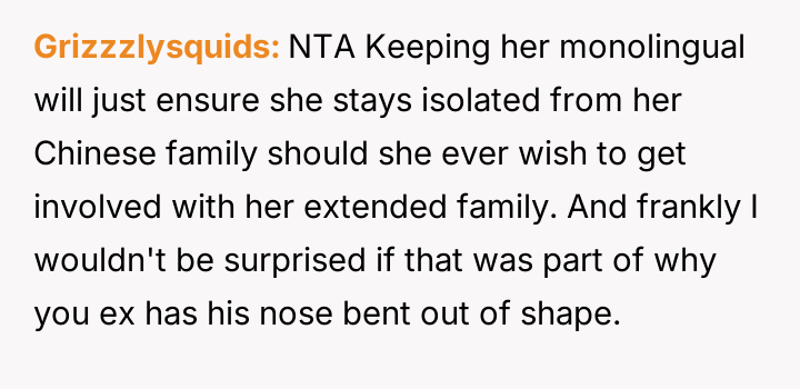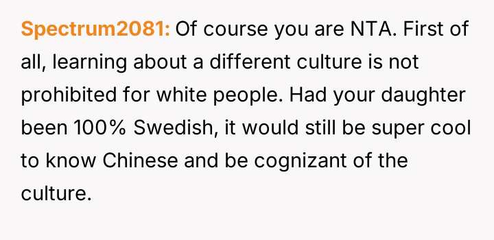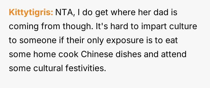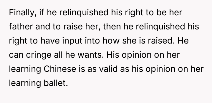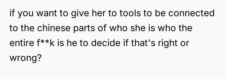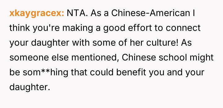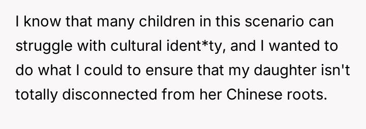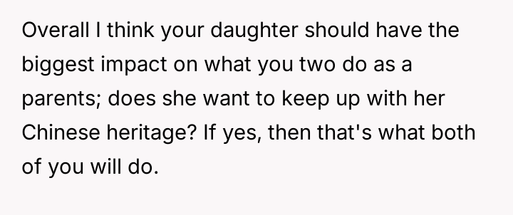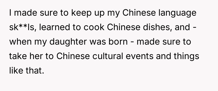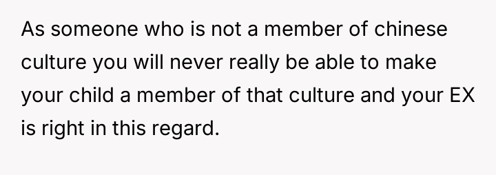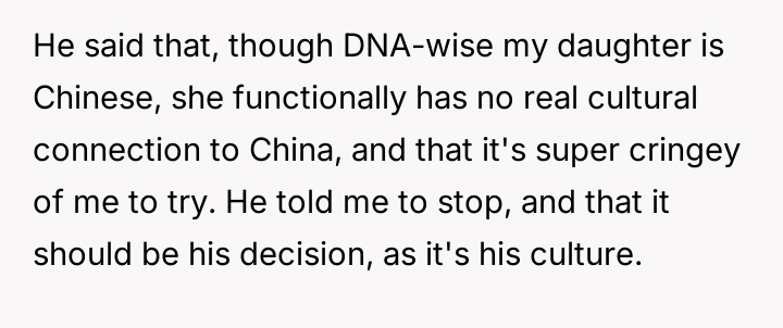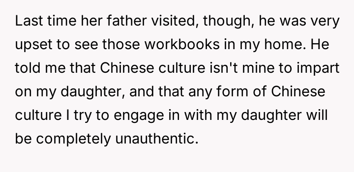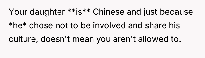 Is the mother overstepping boundaries by actively promoting her daughter's Chinese cultural ident*ty, or is the father unfairly gatekeeping heritage access, especially given his limited involvement in the child's life? Where does the responsibility for cultural transmission lie in a single-parent household?