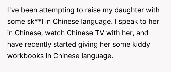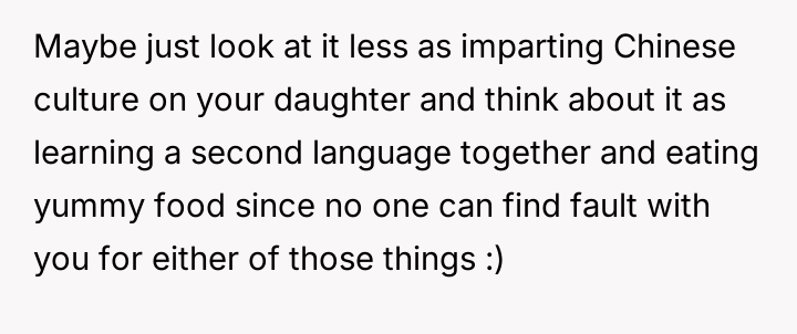 The original poster is deeply invested in ensuring her daughter maintains a connection to her Chinese heritage, driven by her own efforts to learn the language and culture.