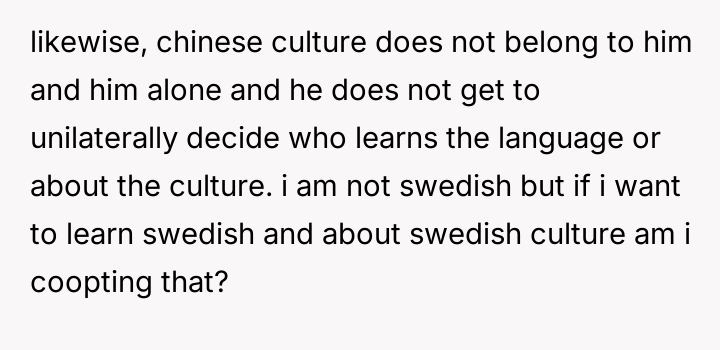 This creates a direct conflict with the ex-boyfriend, who asserts that only he has the cultural right or authority to introduce Chinese culture to their daughter.