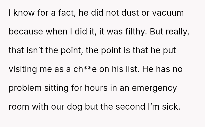 The central conflict lies between the OP's expectation of partnership and dedicated support during illness, rooted in her past experiences, and her husband’s minimal contribution, followed by severe verbal aggression when confronted.
