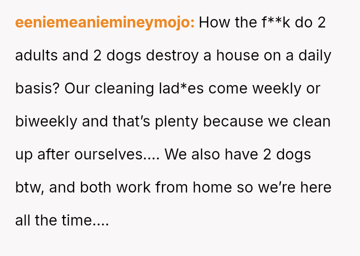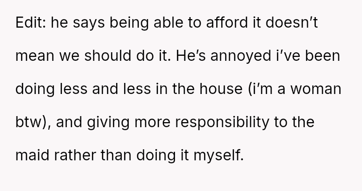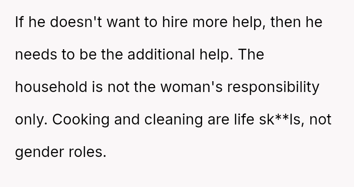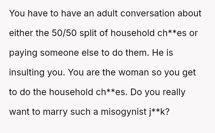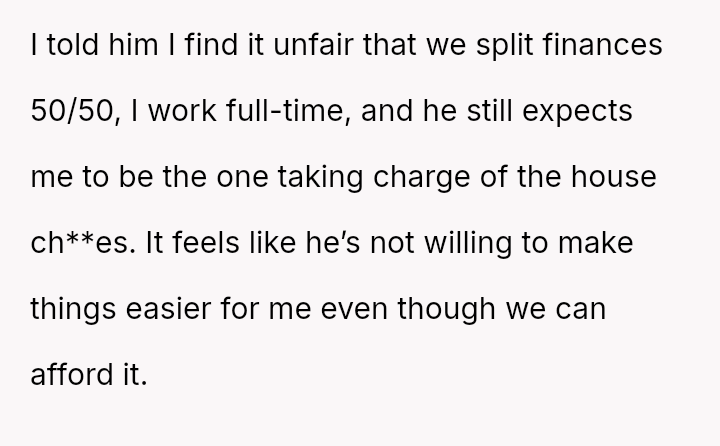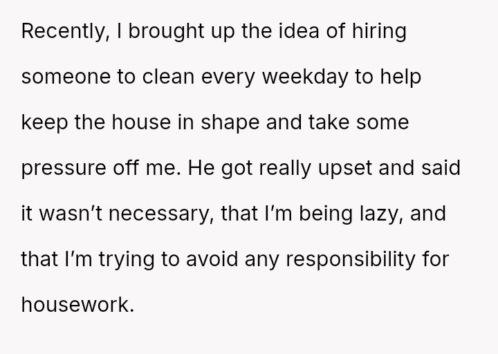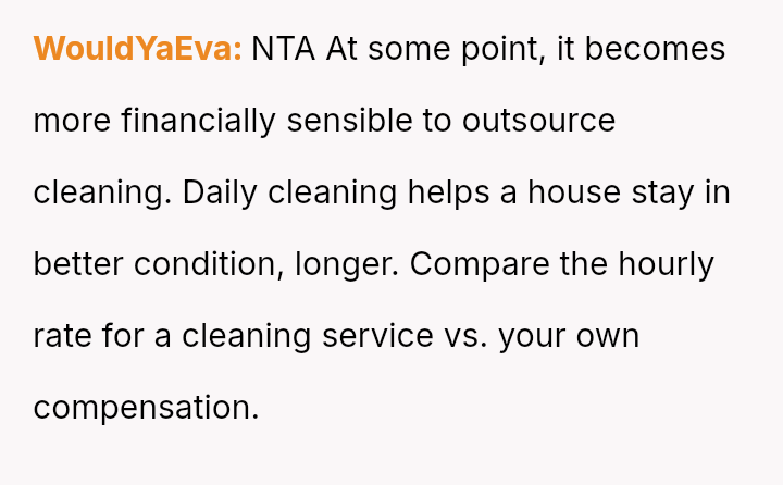 Given the es**blished financial equality and the OP's burnout, is it reasonable for her to unilaterally decide to hire daily cleaning help to maintain her work-life balance, or does her fiancé have a valid point that the financial ability to outsource ch**es does not negate personal responsibility for basic household upkeep?