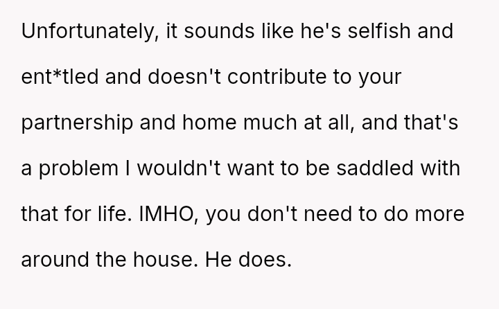 The original poster is experiencing severe burnout due to taking on the majority of domestic labor, despite an equal financial contribution to the household.